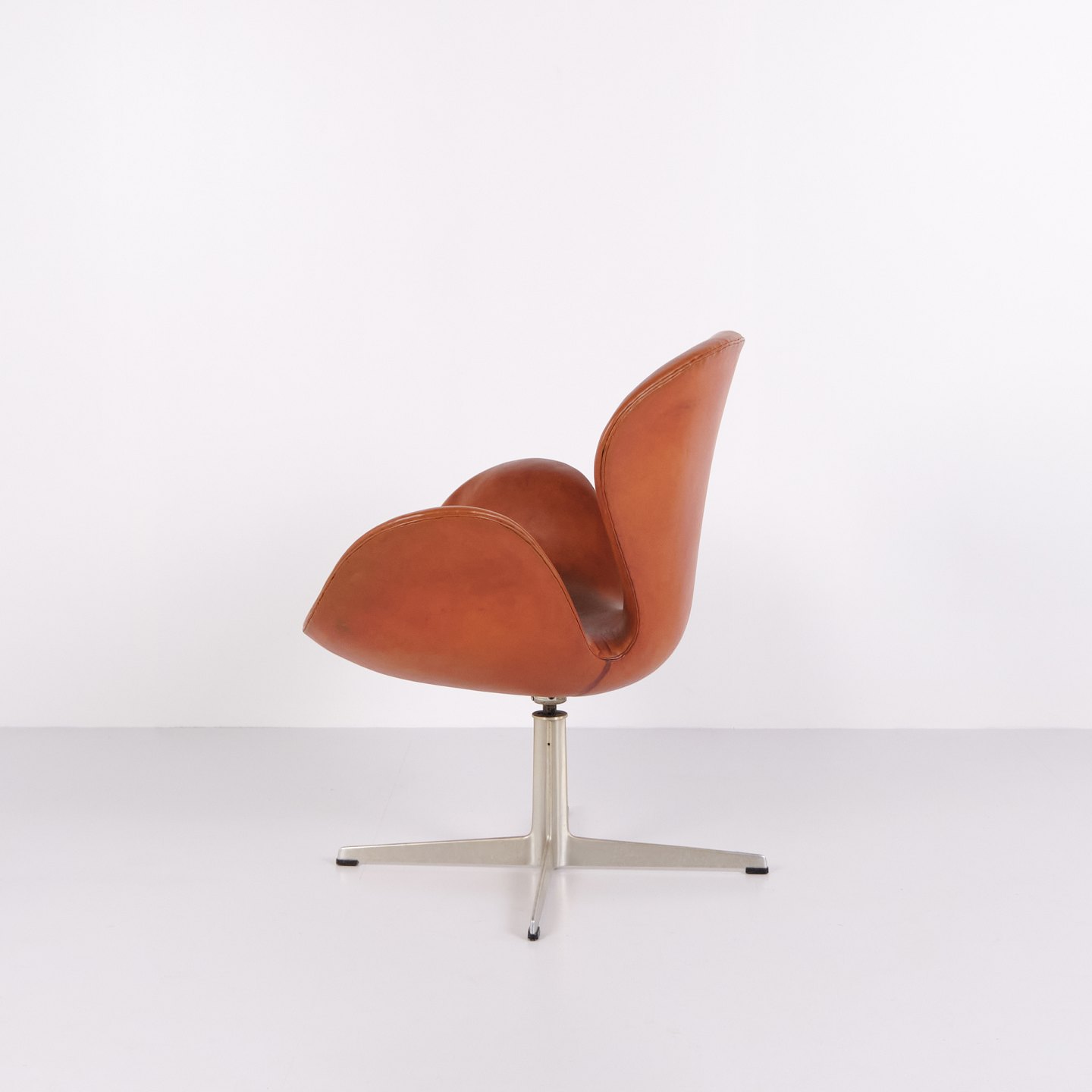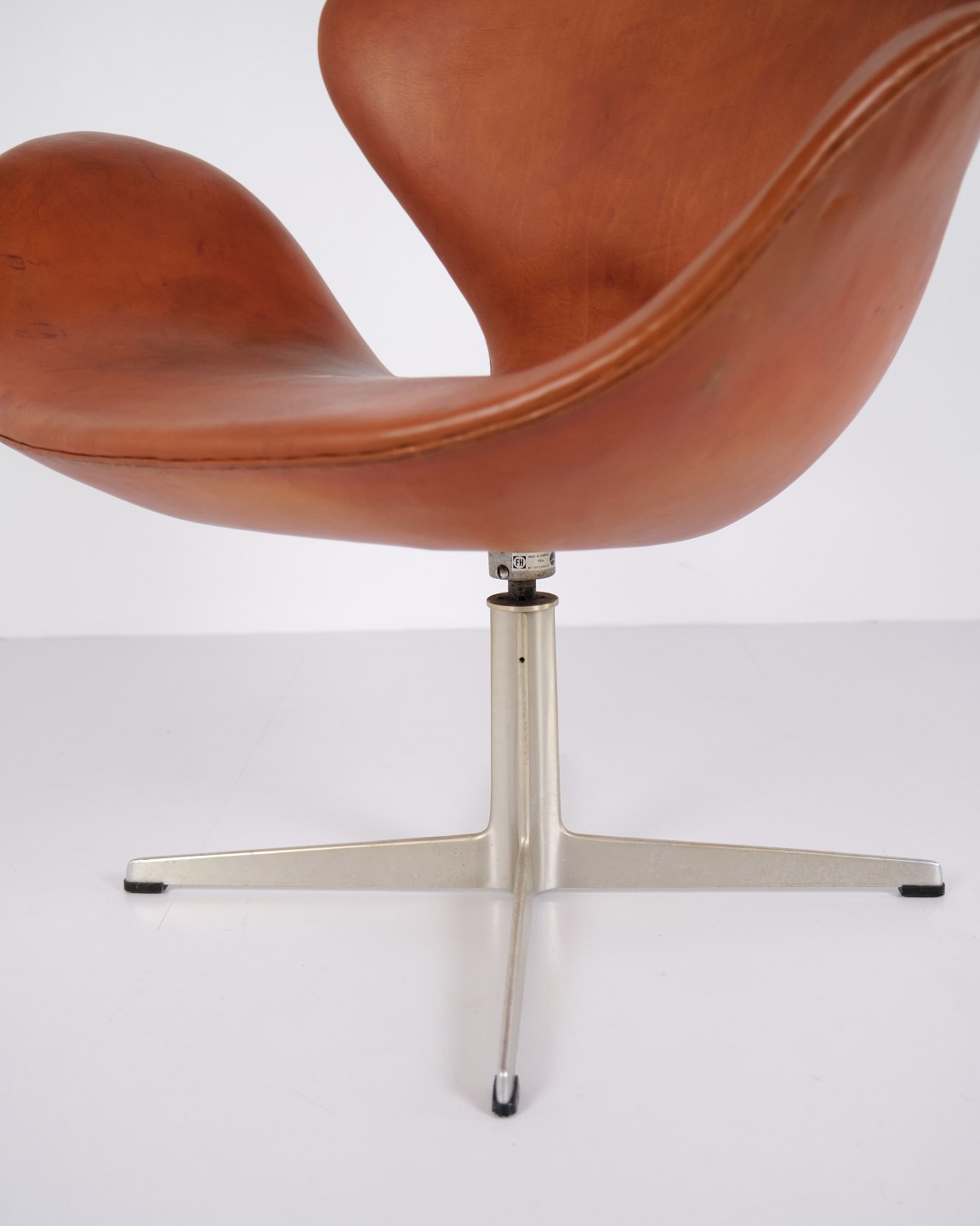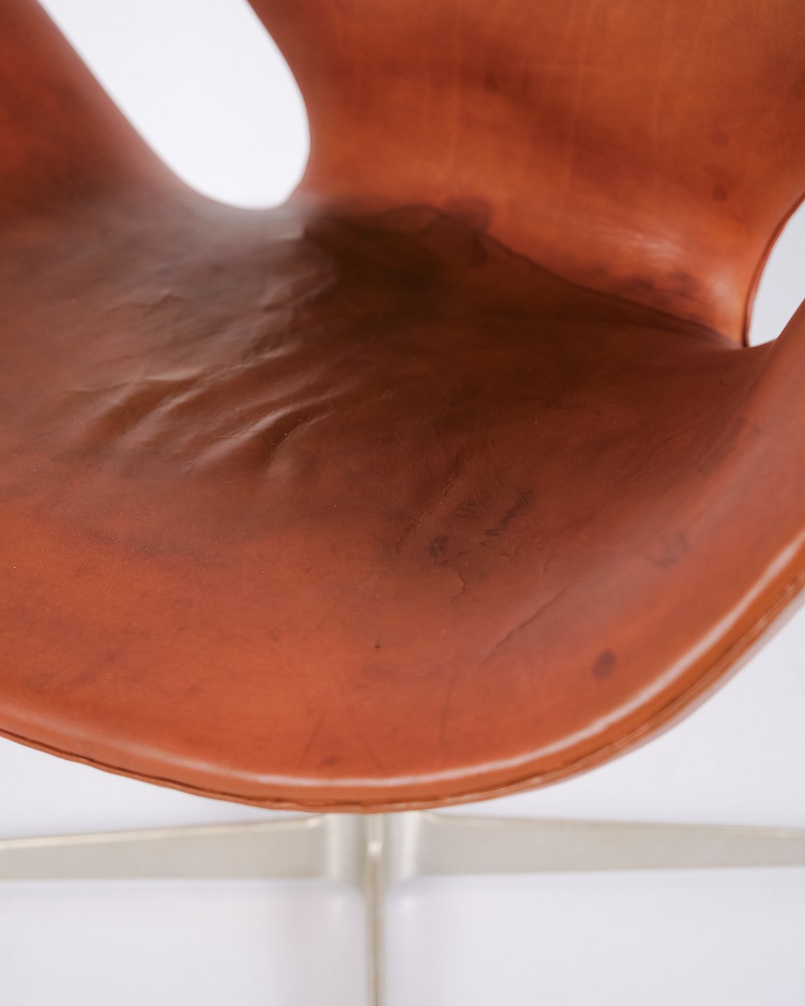 The Swan model 3320 by Arne Jacobsen for Fritz Hansen in original cognac leather from the 1960s. Iconic Danish design.