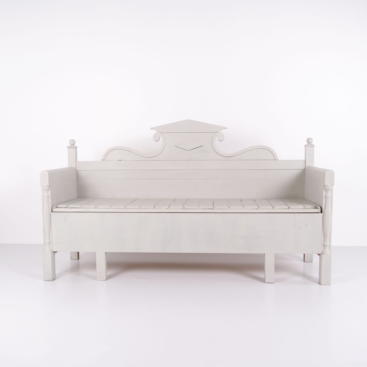 Antique Storage Bench With Carvings – Grey Painted – Pine Wood – 1860s