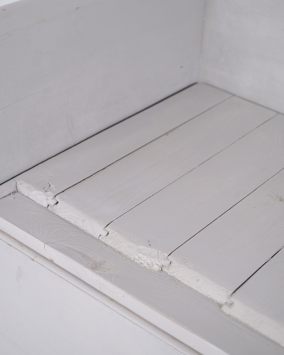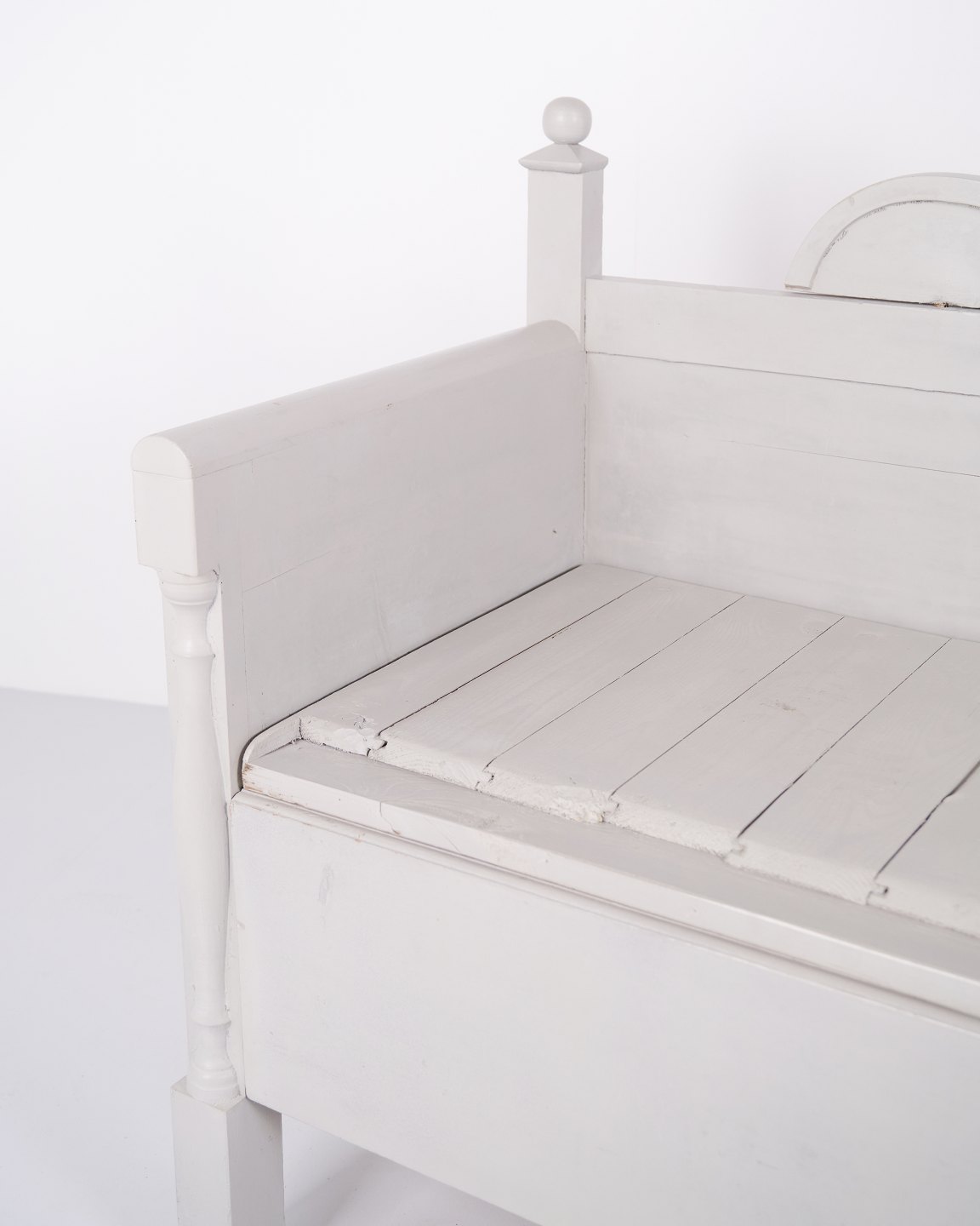 Antique storage bench from the 1860s in grey-painted pine wood with carved details and storage. Antique storage bench from the 19th century.
