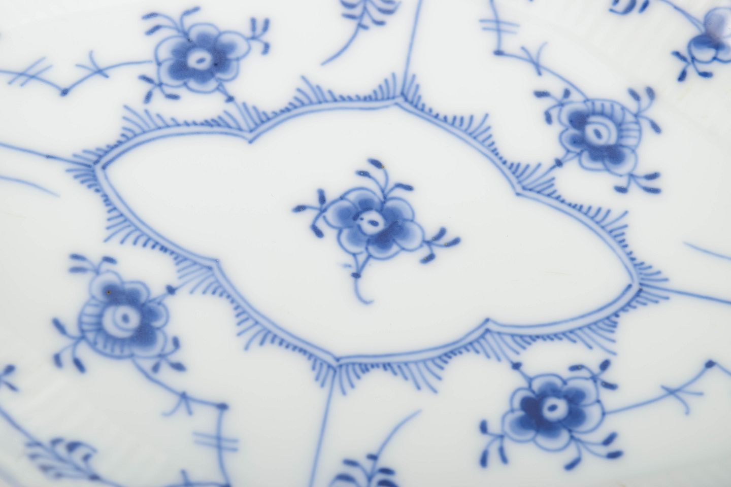 Oval porcelain dish decorated with hand-painted cobalt blue underglaze in the classic Blue Fluted Plain pattern. Model 1/147. The softly faceted, gently contoured shape with a moulded rim and segmented well is richly adorned with floral and scrolling motifs, exemplifying Royal Copenhagen’s refined craftsmanship of the interwar period.
