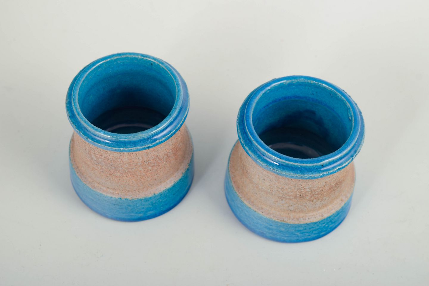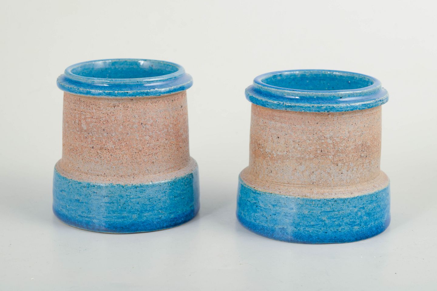 Pair of small cylindrical vases in thrown stoneware with a glossy blue glaze at the base and rim, combined with a sand-coloured unglazed central section. Simple, functional forms characteristic of Danish modernism from the 1960s.