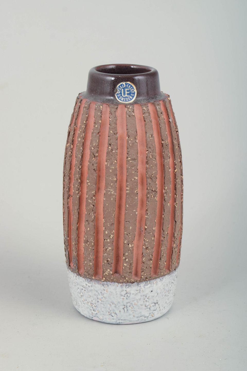 Small cylindrical glazed ceramic vase with a slightly narrowed neck. The body is decorated with vertical relief-applied stripes in terracotta tones against a darker, lightly speckled ground glaze, finished with a light, coarsely textured base. The decoration creates a strong tactile and modernist expression. Model number 4594.