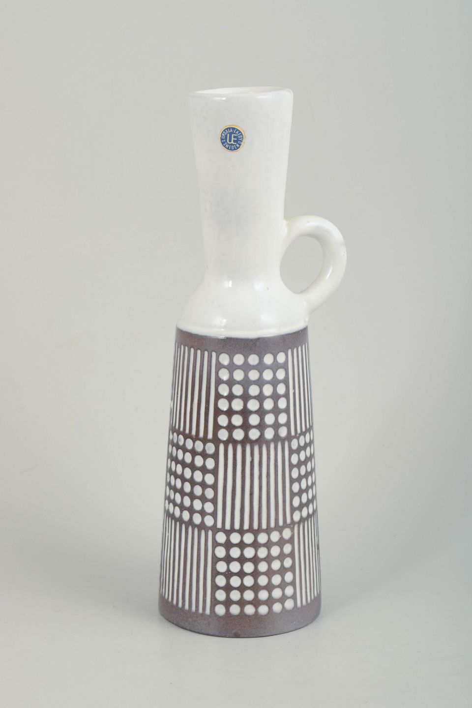 Tall, slender glazed ceramic pitcher with a narrow neck and single handle. The lower section is decorated with a strict graphic pattern of dots and vertical lines in white against a brown ground glaze, while the upper section is finished in white glaze. The rhythmic decoration gives the piece a clear modernist character. Model number 4564.