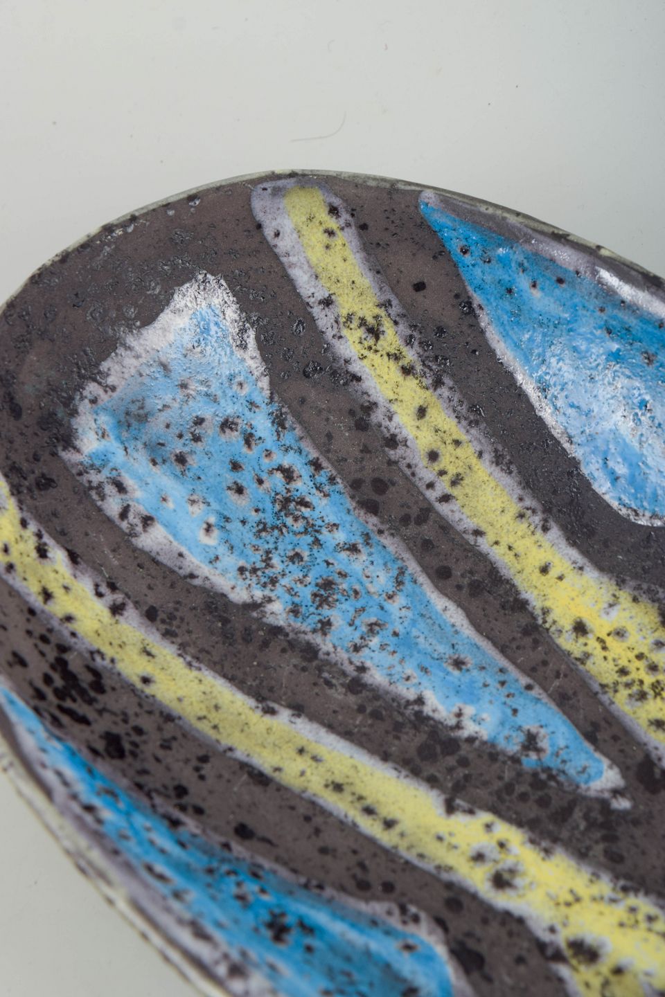 Large, organically shaped oval bowl in glazed ceramic with an abstract, hand-decorated pattern in blue, yellow and dark tones, featuring a characteristic speckled/splashed glaze effect.