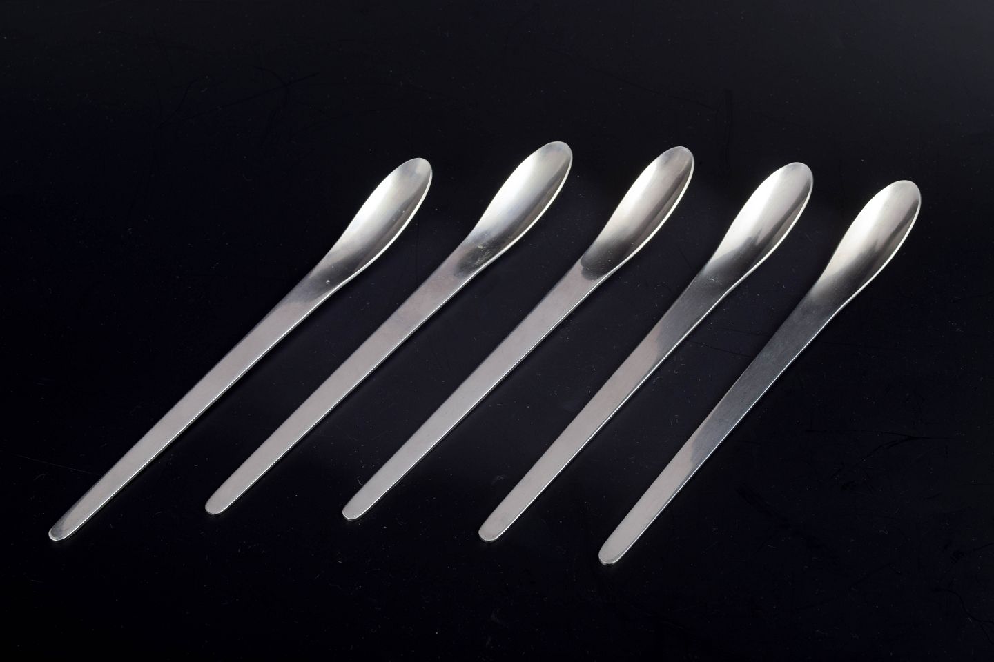Set comprising five long caffe latte spoons in stainless steel with a slim, minimalist design. Intended for tall glasses and mugs, suitable for coffee and dessert service.