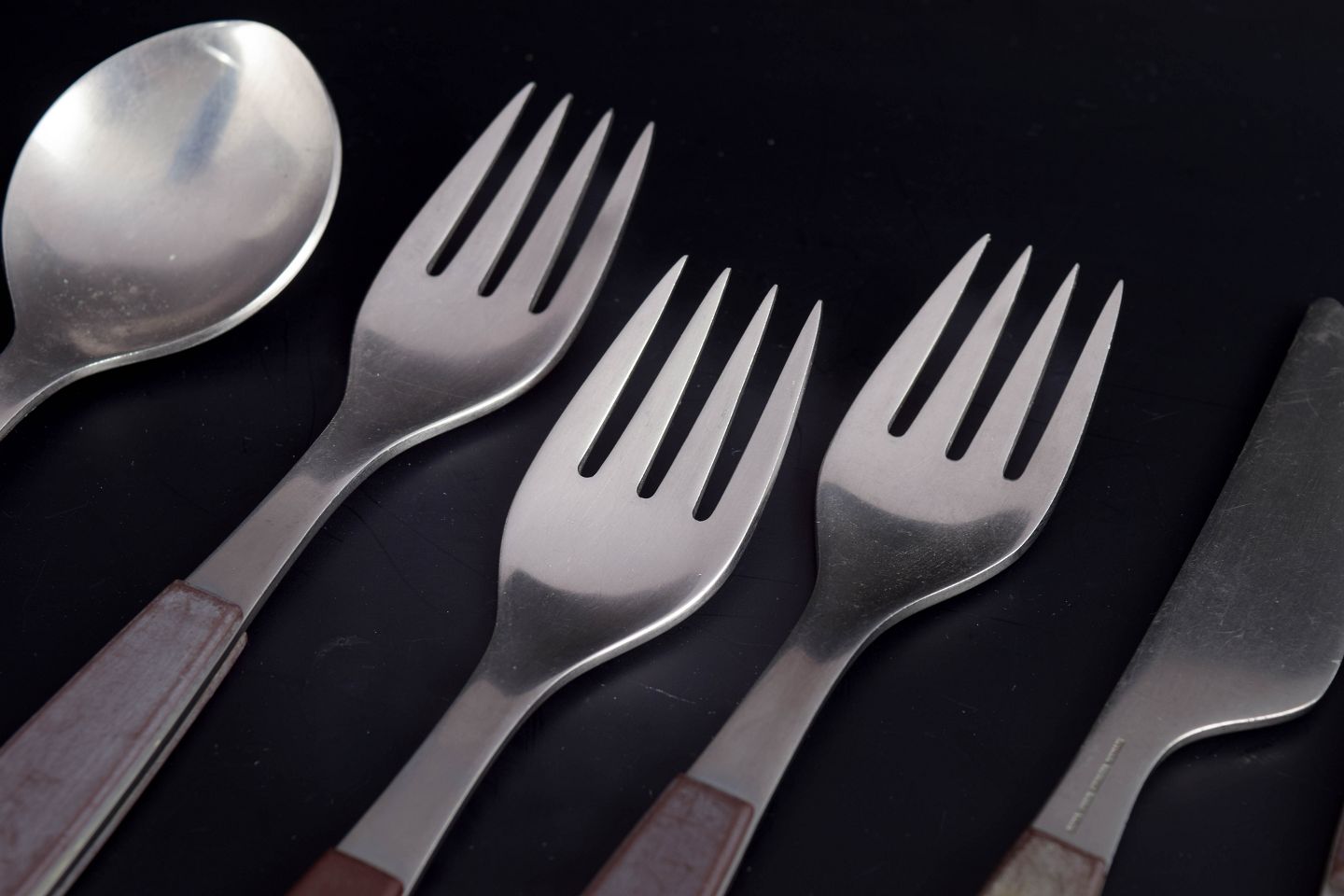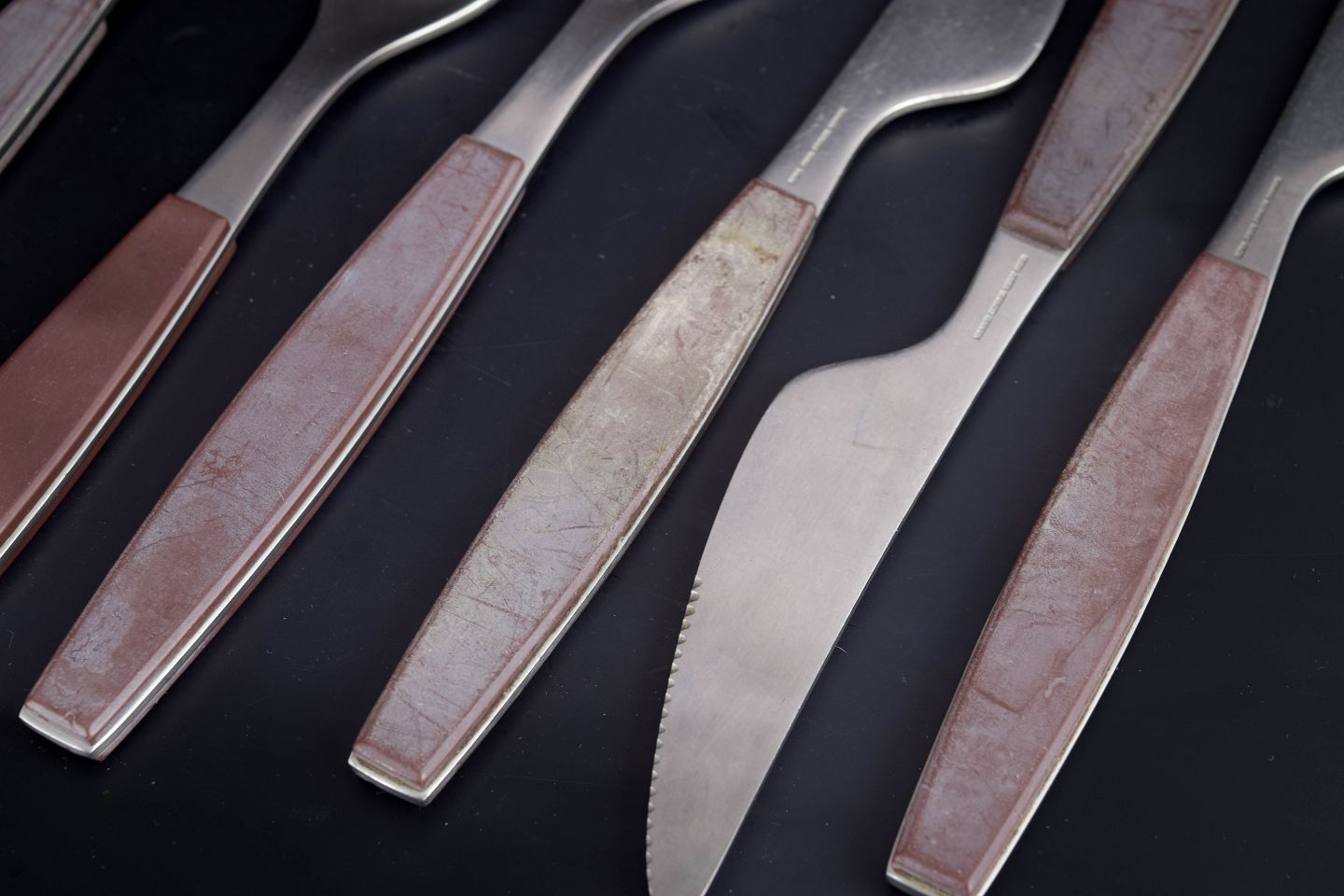 Set comprising three dinner knives, three dinner forks, and three table spoons in stainless steel with brown handles. The model is from the Strata series.