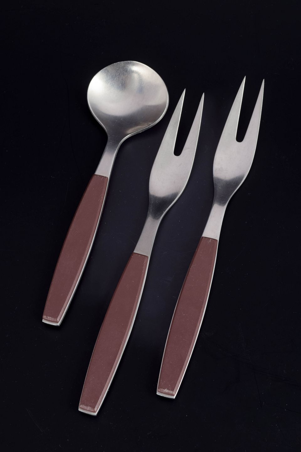 Set comprising two cold-meat/serving forks and a bouillon spoon in stainless steel with brown handles. The model is from the Strata series.