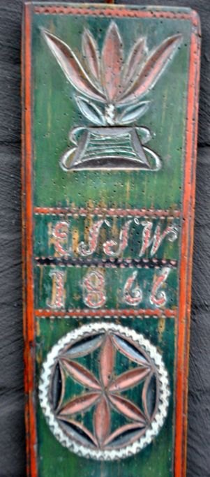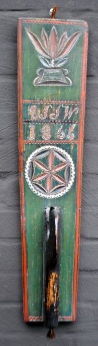 Danish mangle board, 19th century. Beech wood. With horse grip and carved carvings. Dated 1866 and engraved: ESSW. Painted green and red. L.: 61 cm.