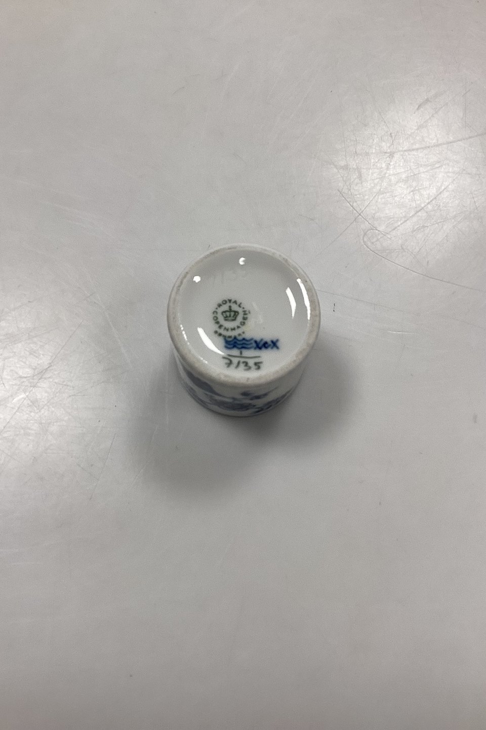 Royal Copenhagen Blue Fluted Plain Sake Cup No. 7135. Measures 4.5 cm x 4.5 cm / 1.77 in. x 1.77 in. 1st Quality