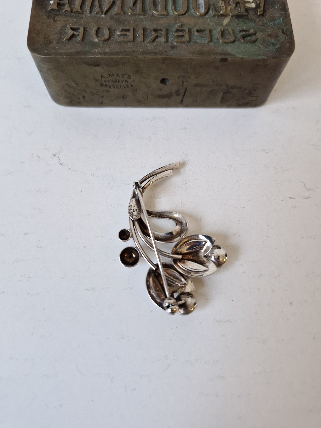 Vintage silver brooch in the shape of leaves and flowers with purple stones by Hermann Siersbøl