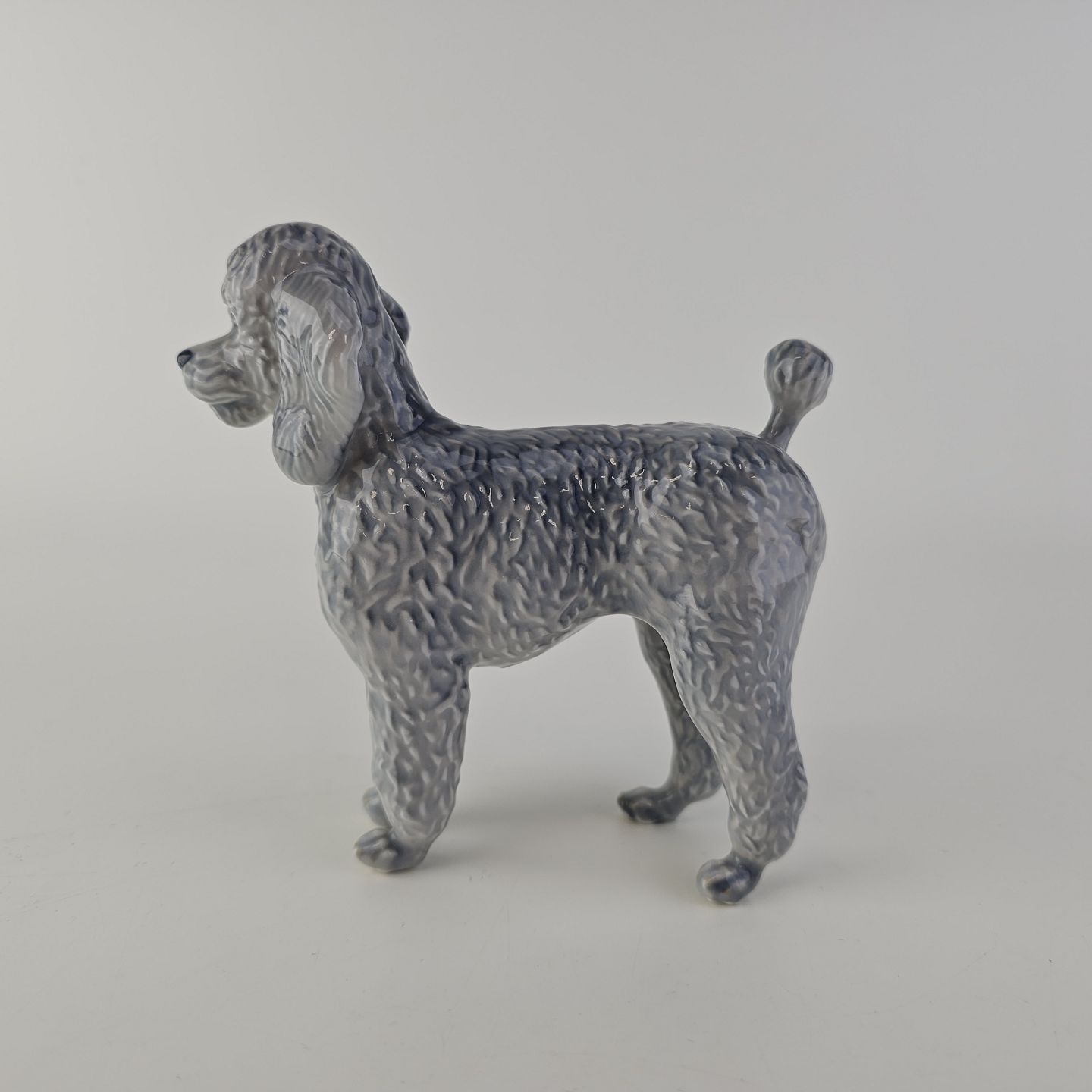 Figur i kongeligt porcelæn med form af en stående grå puddelhund