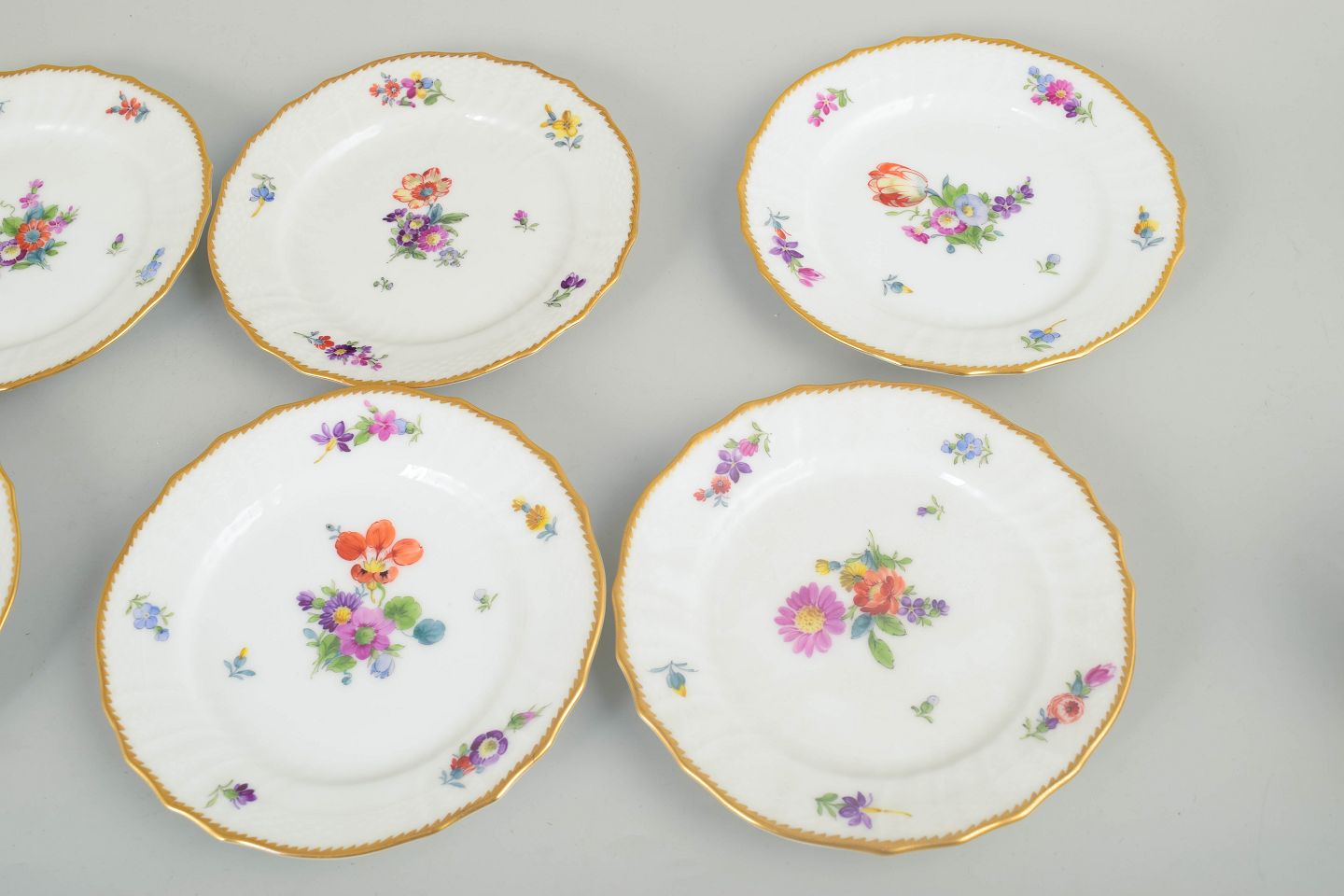 Set of eight cake plates in white-glazed porcelain with hand-painted floral decoration from the Saxon Flower series and a gilt rim; model 4/1627.
