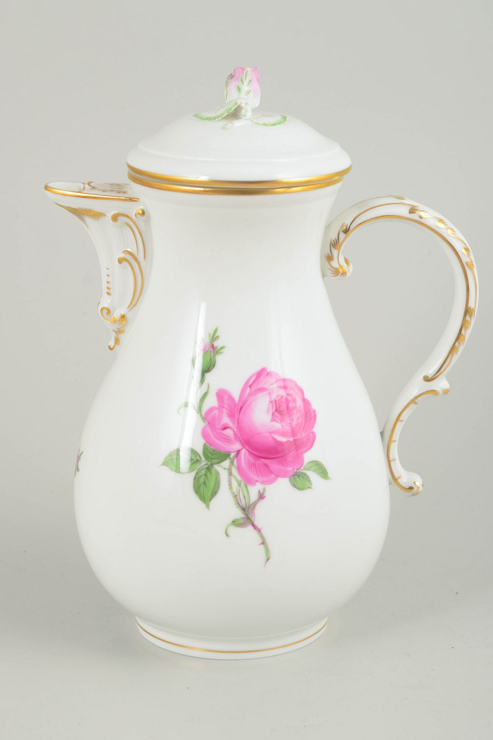 Coffee pot in white porcelain with hand-painted polychrome pink flower decoration from the Pink flower series and gilt accents. Baluster-shaped body with curved handle and finial to the lid.
