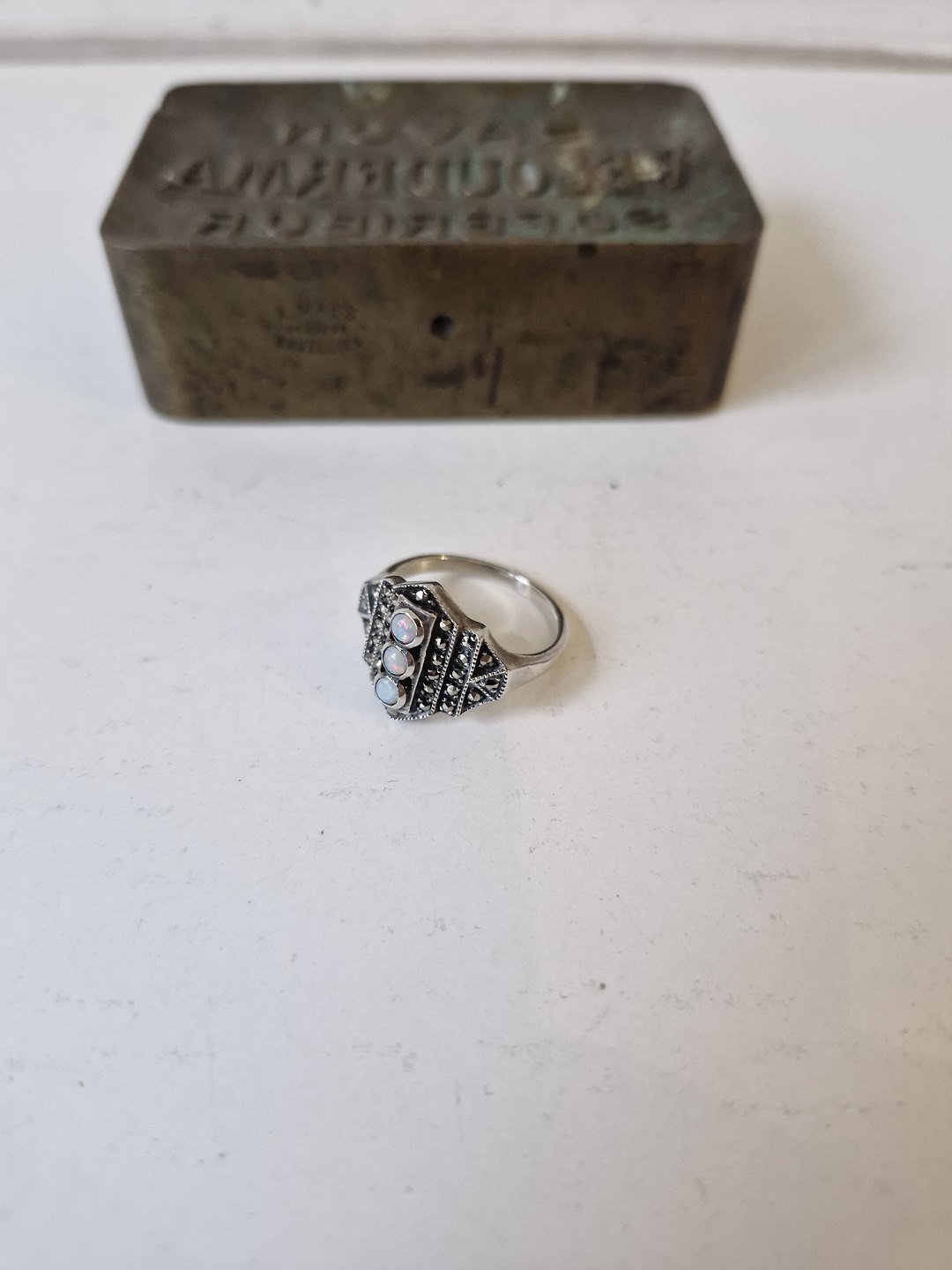 Art deco ring in sterling silver with three opals surrounded by marcasites