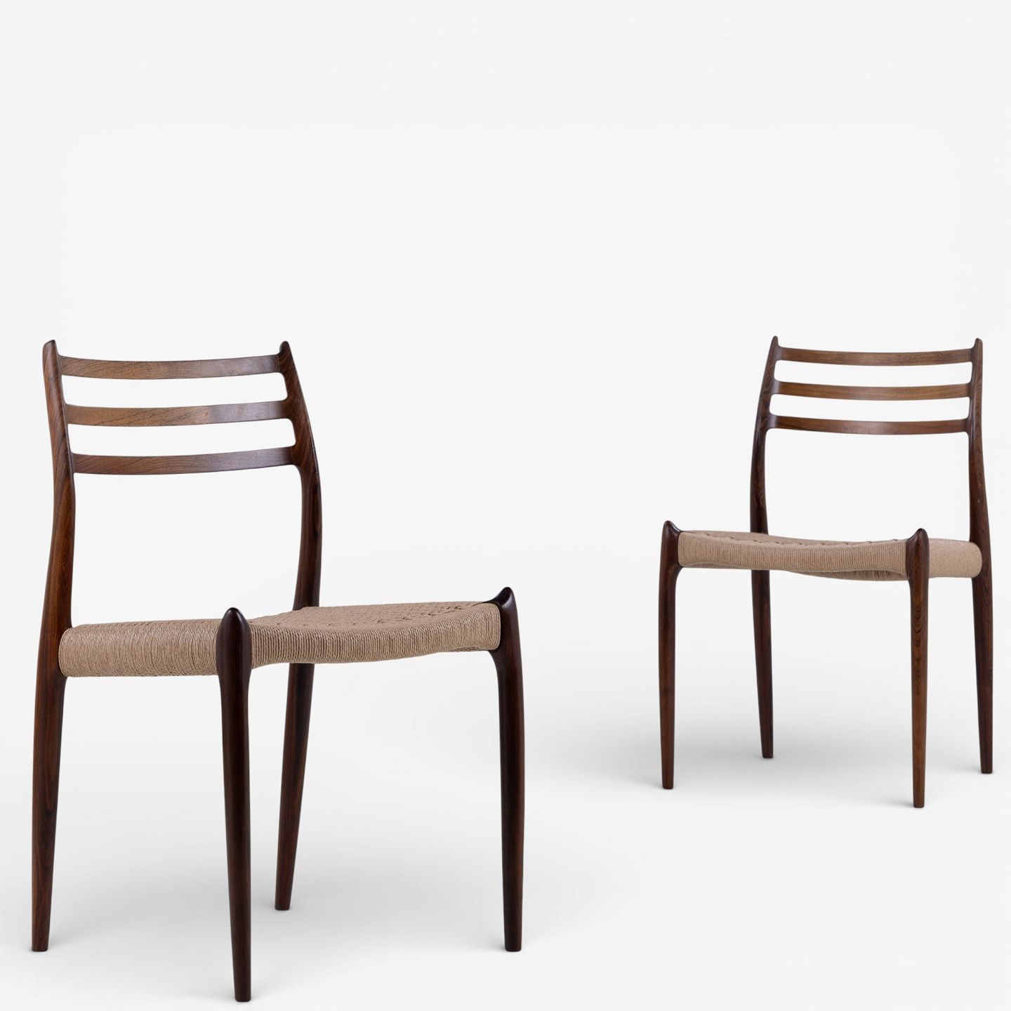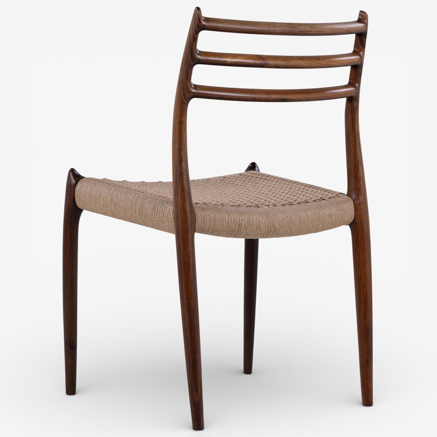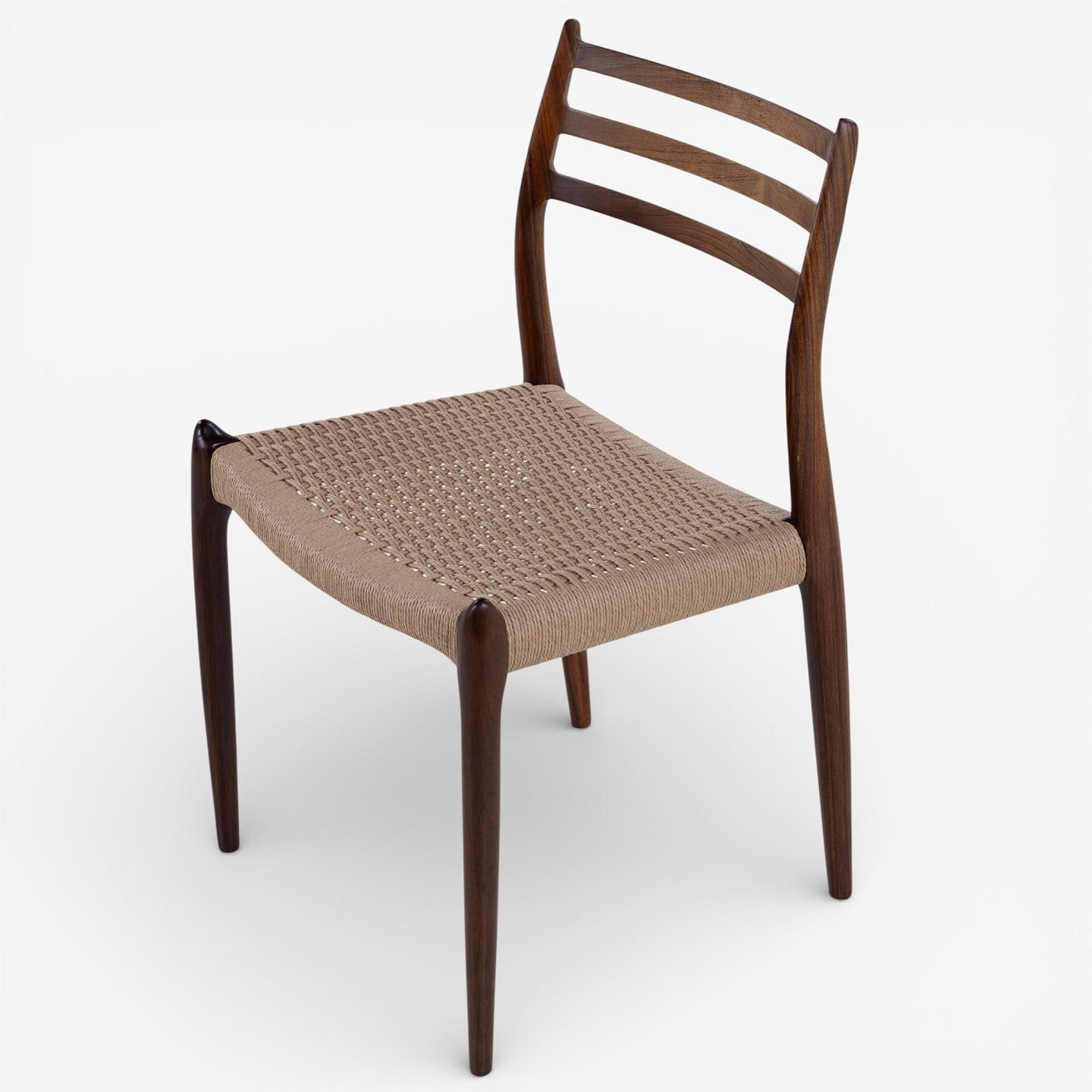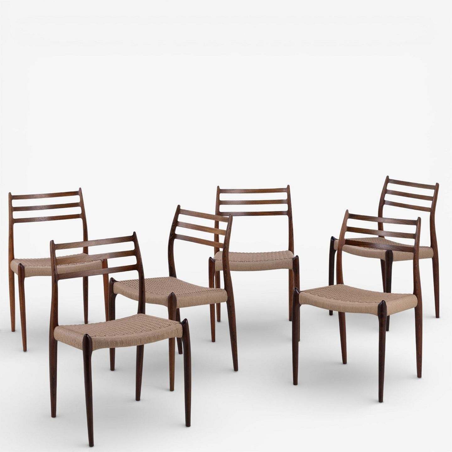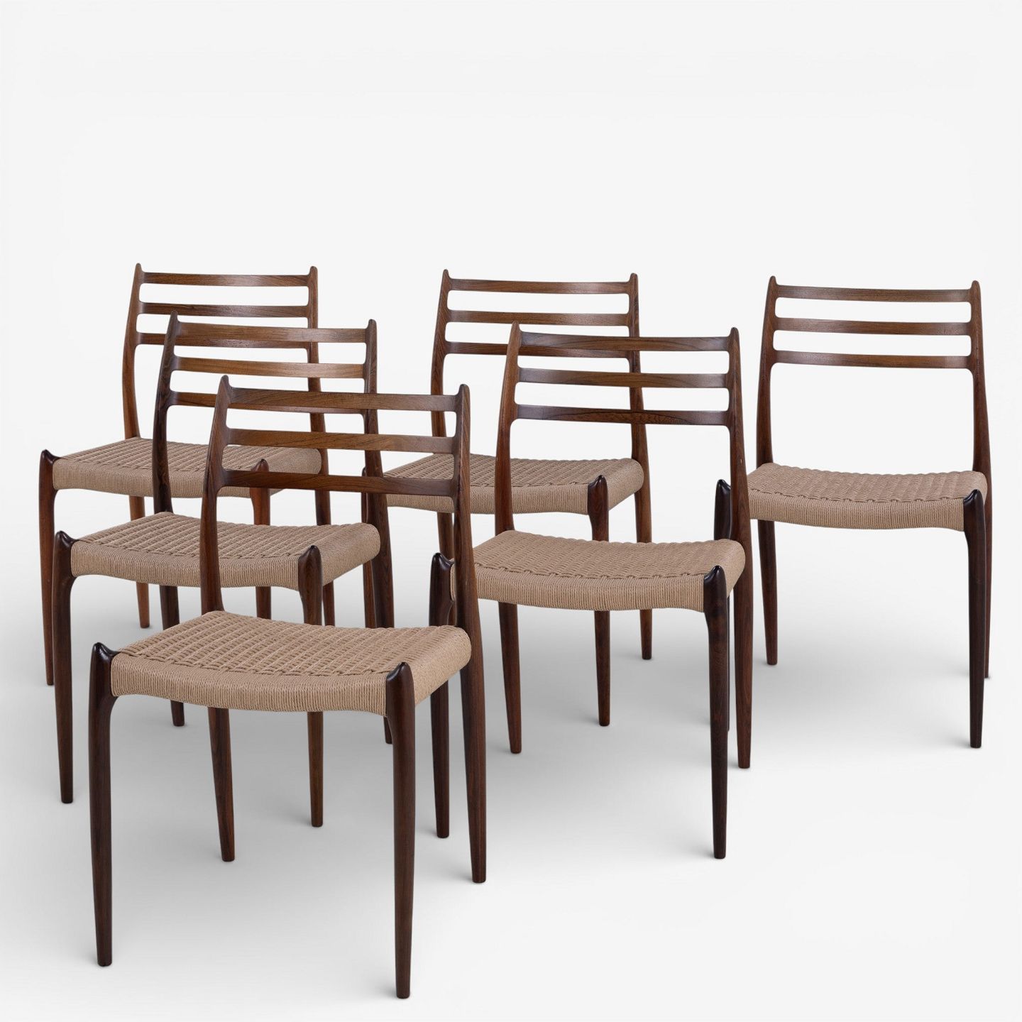 NO 78 - Set of 6 dining chairs in rosewood with paper yarn seats. Manufacturer's mark.