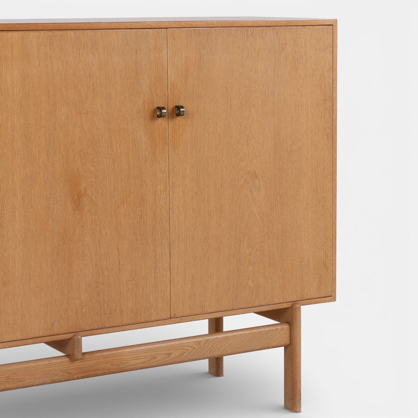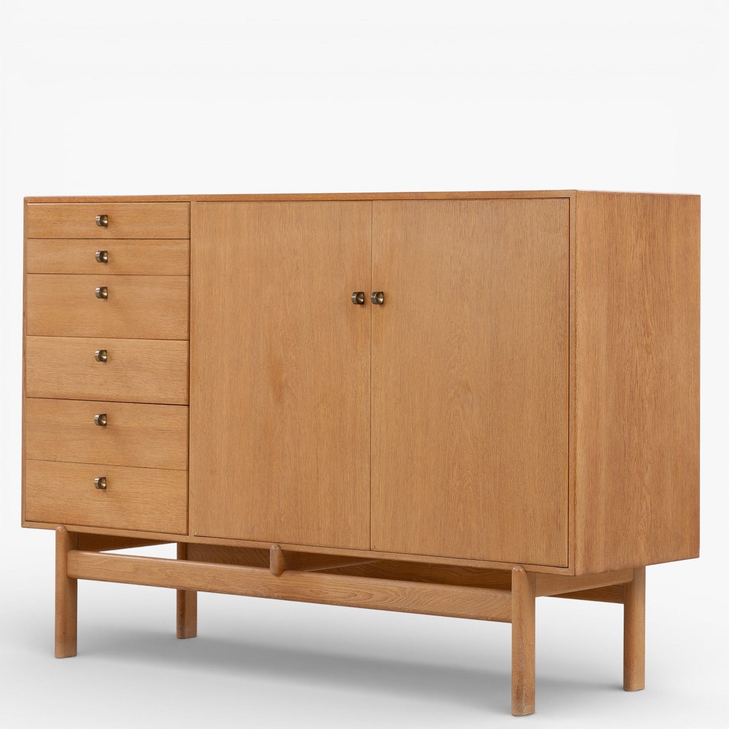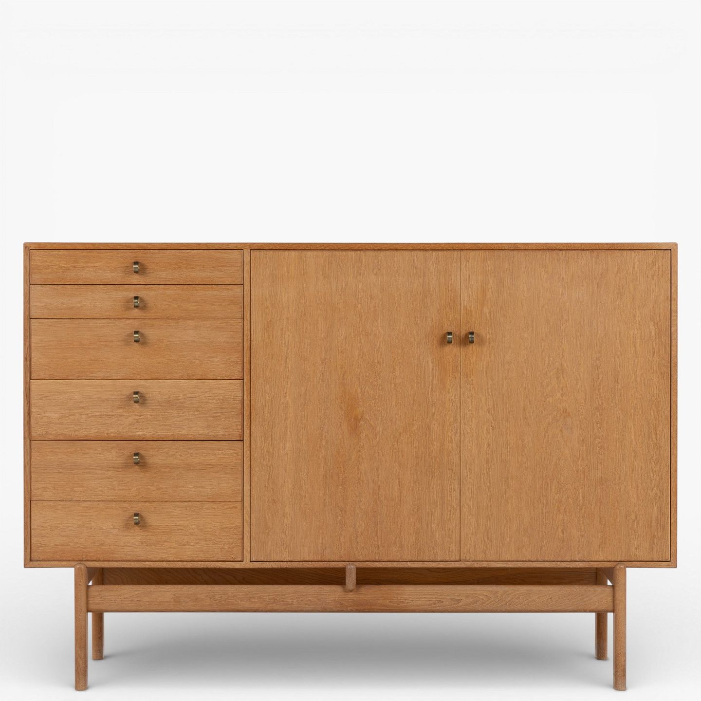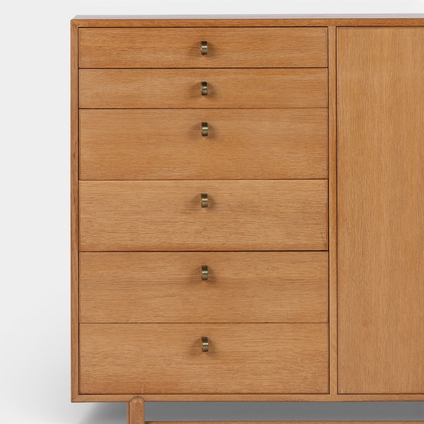 Sideboard in patinated oak with two doors and eight drawers with brass handles. Stamped by manufacturer.