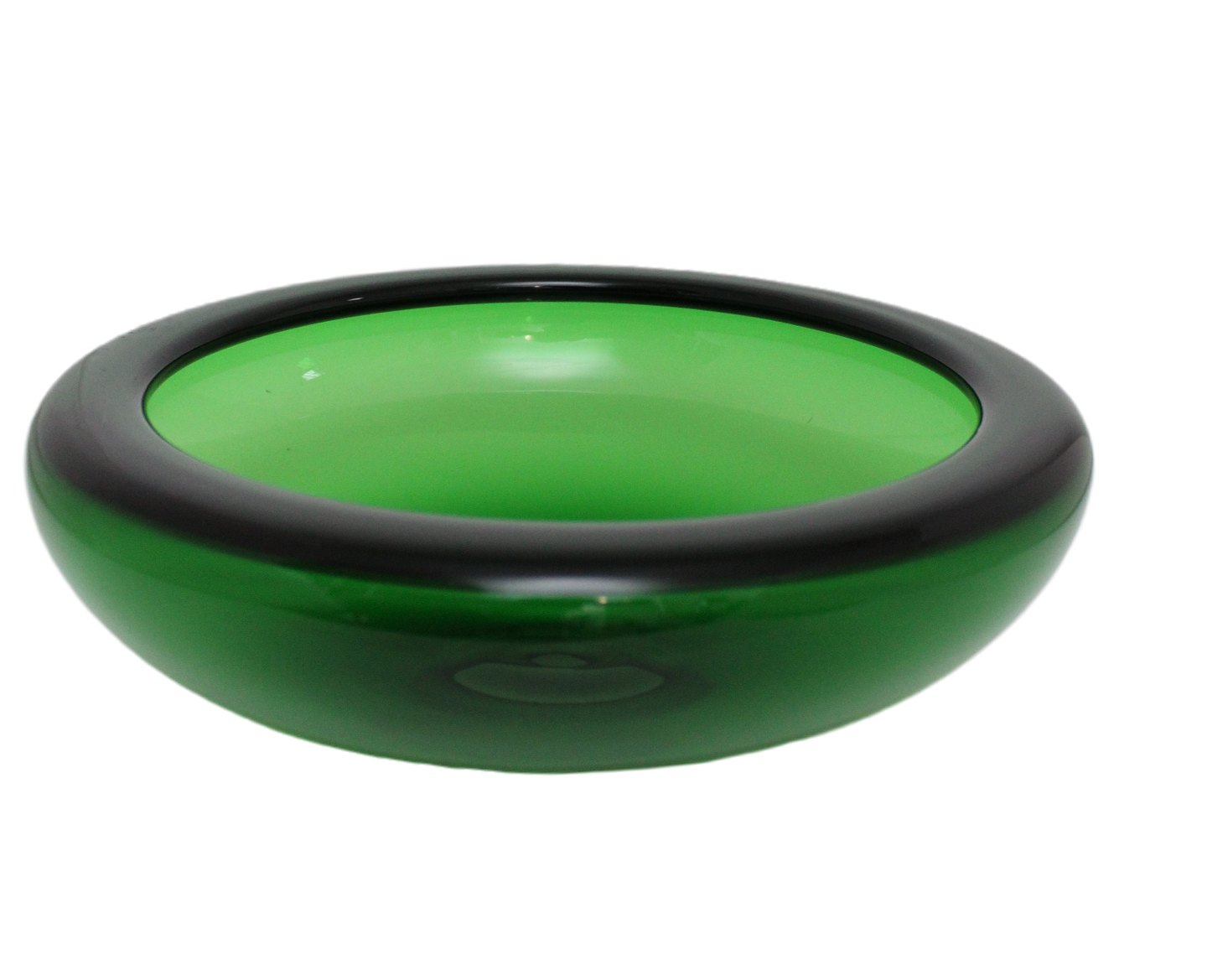 Text available in Danish: Holmegaard, Provence/Arne skål designet af Per Lütken i 1955. Flad skål i mellemstørrelse, ædelgrønt glas i god stand med enkelte brugsspor og ridser. Signeret Holmegaard PL17792. Højde 7,5 cm. Diameter 26 cm. Pris: 375 kr.