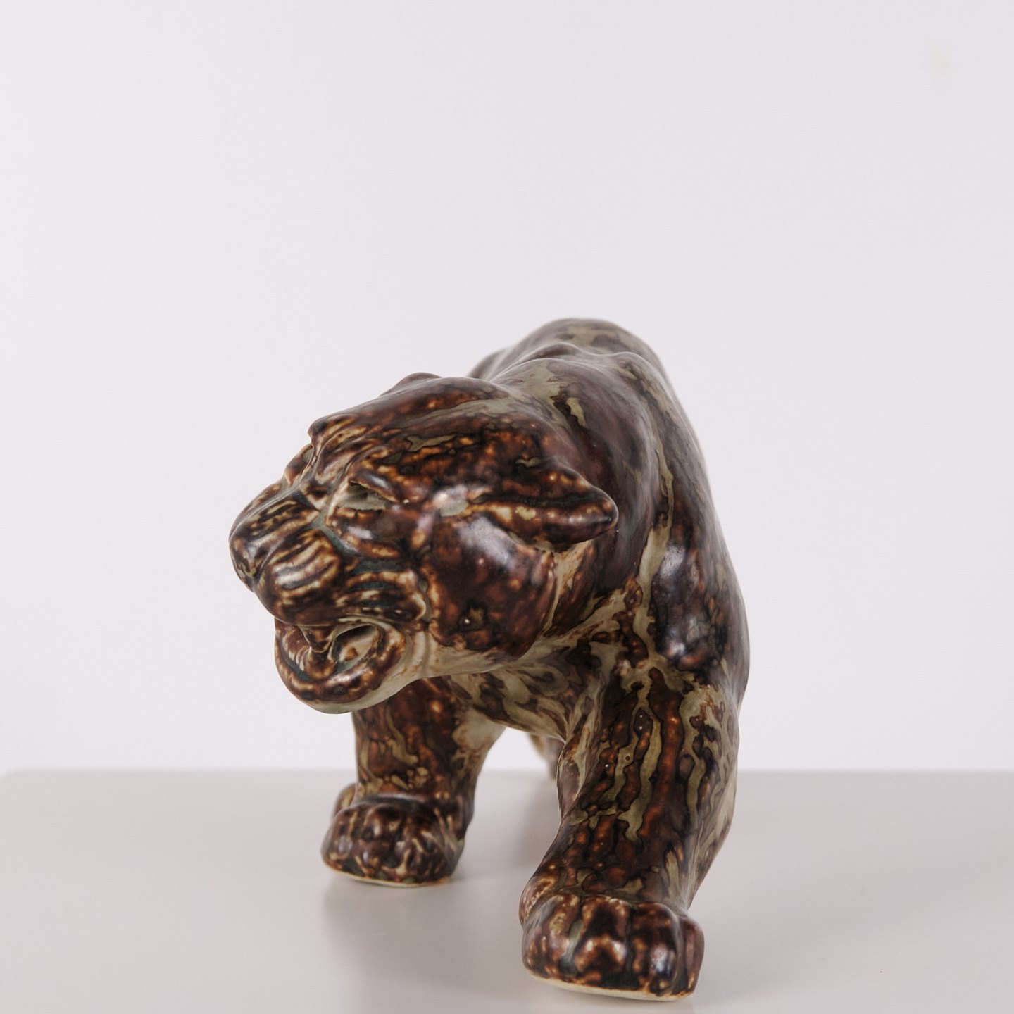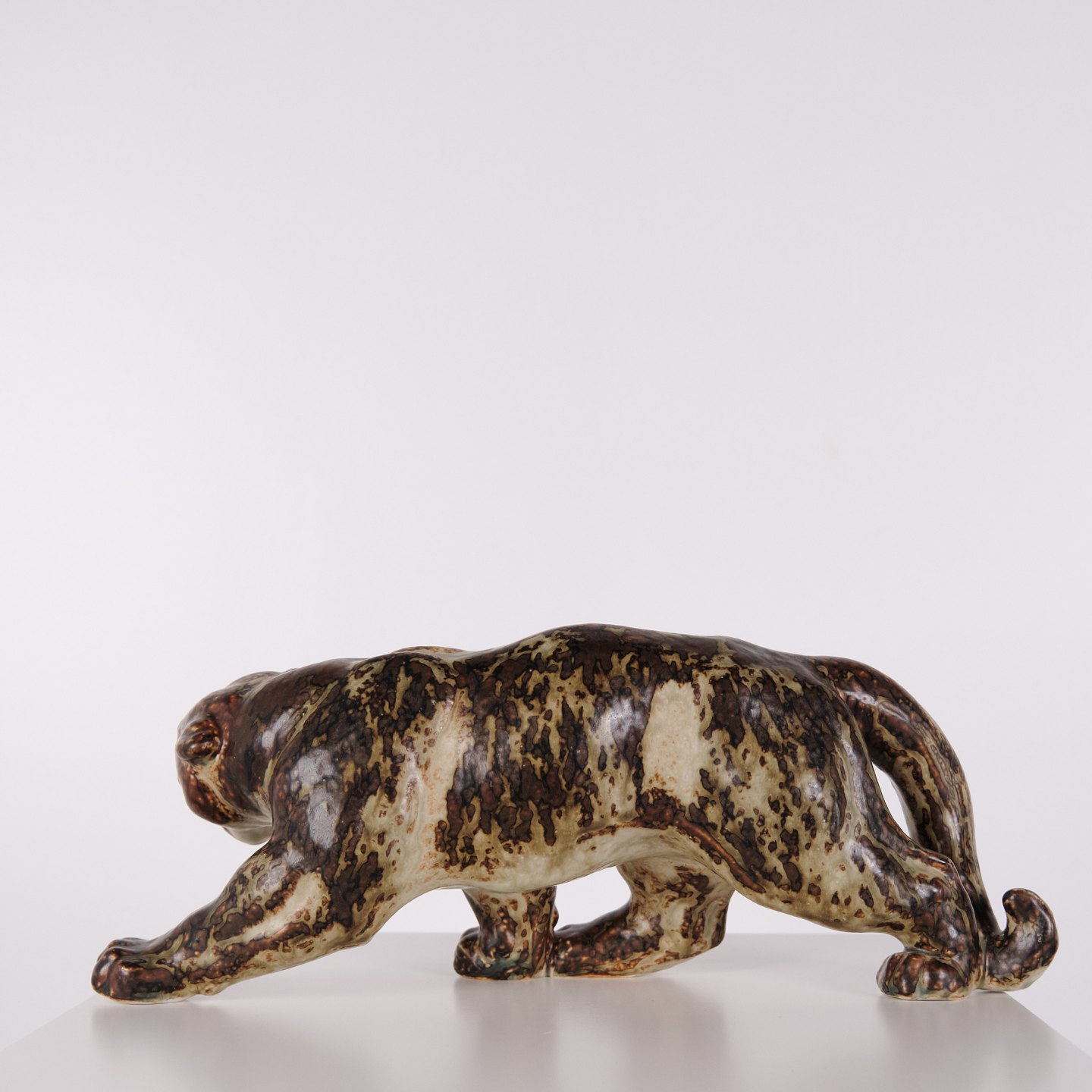 Stoneware figure depicting a panther, model 20283, designed by Knud Kyhn for Royal Copenhagen. The figure is executed in stoneware and is part of Kyhn’s animal sculptures produced at Royal Copenhagen, recognised for their emphasis on form and movement within Danish ceramic design.