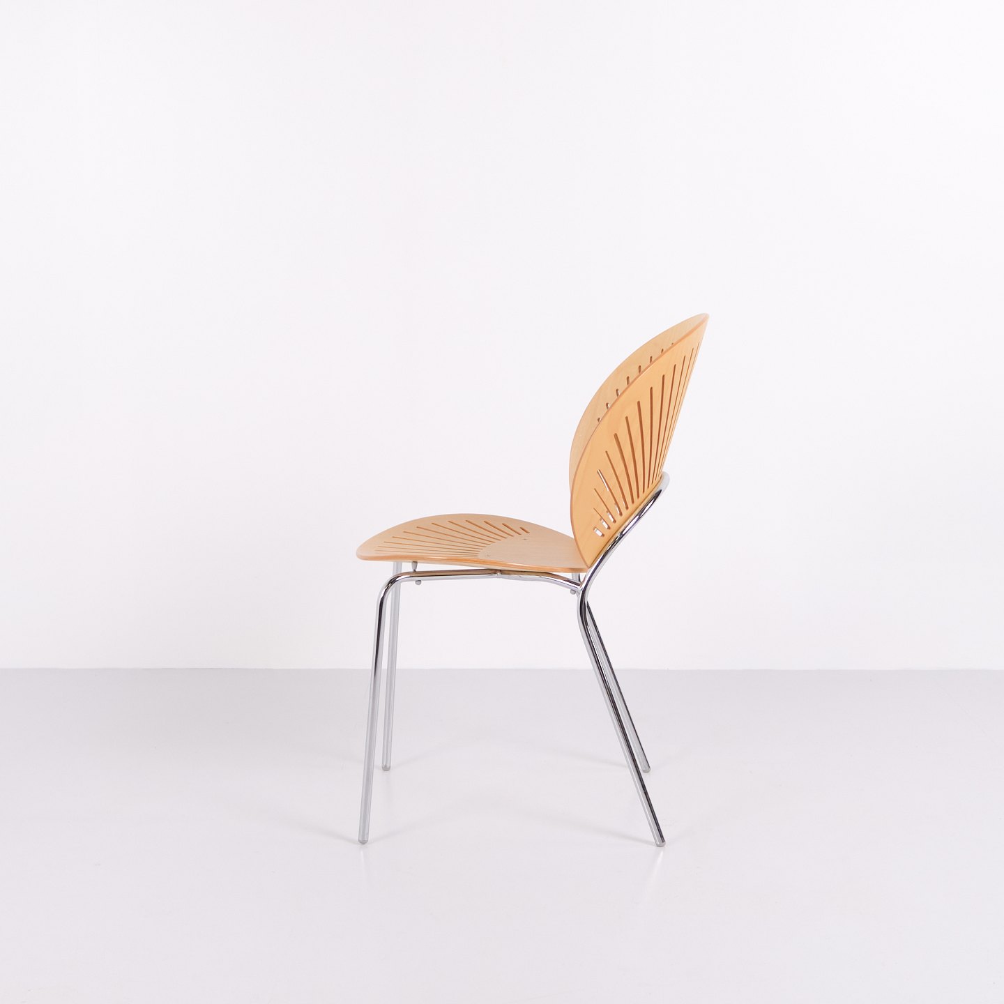 Set of five dining chairs, Trinidad model 3398, designed by Nanna Ditzel. The Trinidad chair is known for its characteristic cut-out backrest and was introduced in the 1990s. The model has been used both as a dining chair and conference chair and is part of Danish furniture design from the late 20th century.