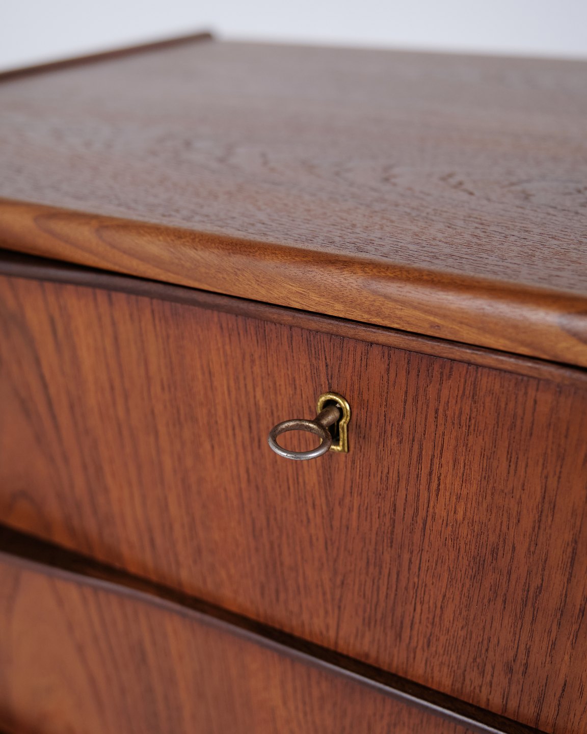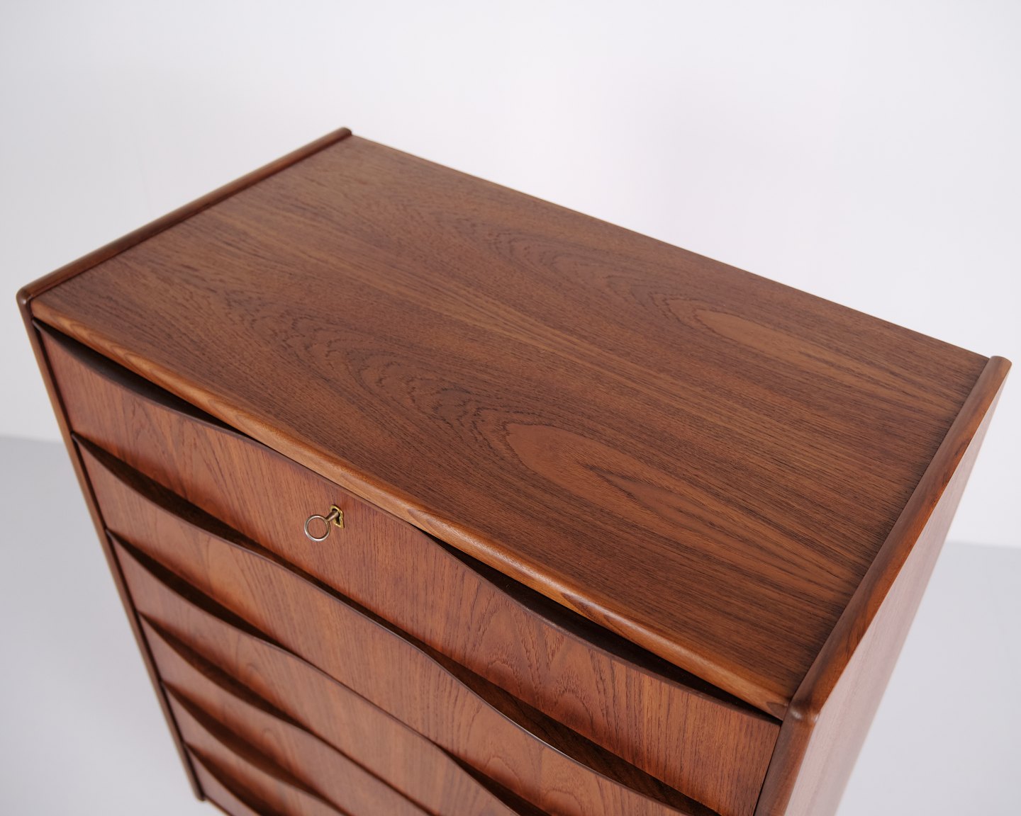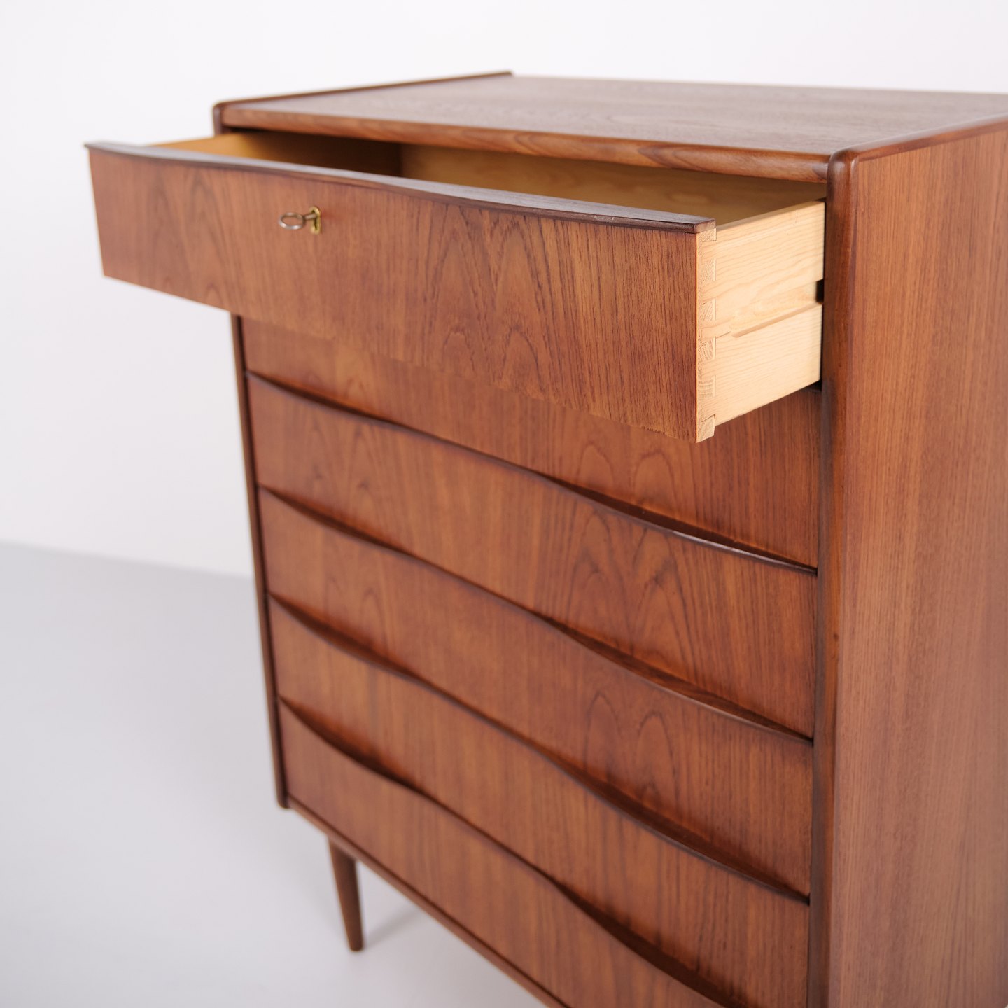 Chest of drawers made of teak with six drawers and original handles. The piece is representative of Danish furniture design from the 1950s, focusing on functionality, storage and material quality. The tall format makes it suitable for use in a bedroom, hallway or living area.
