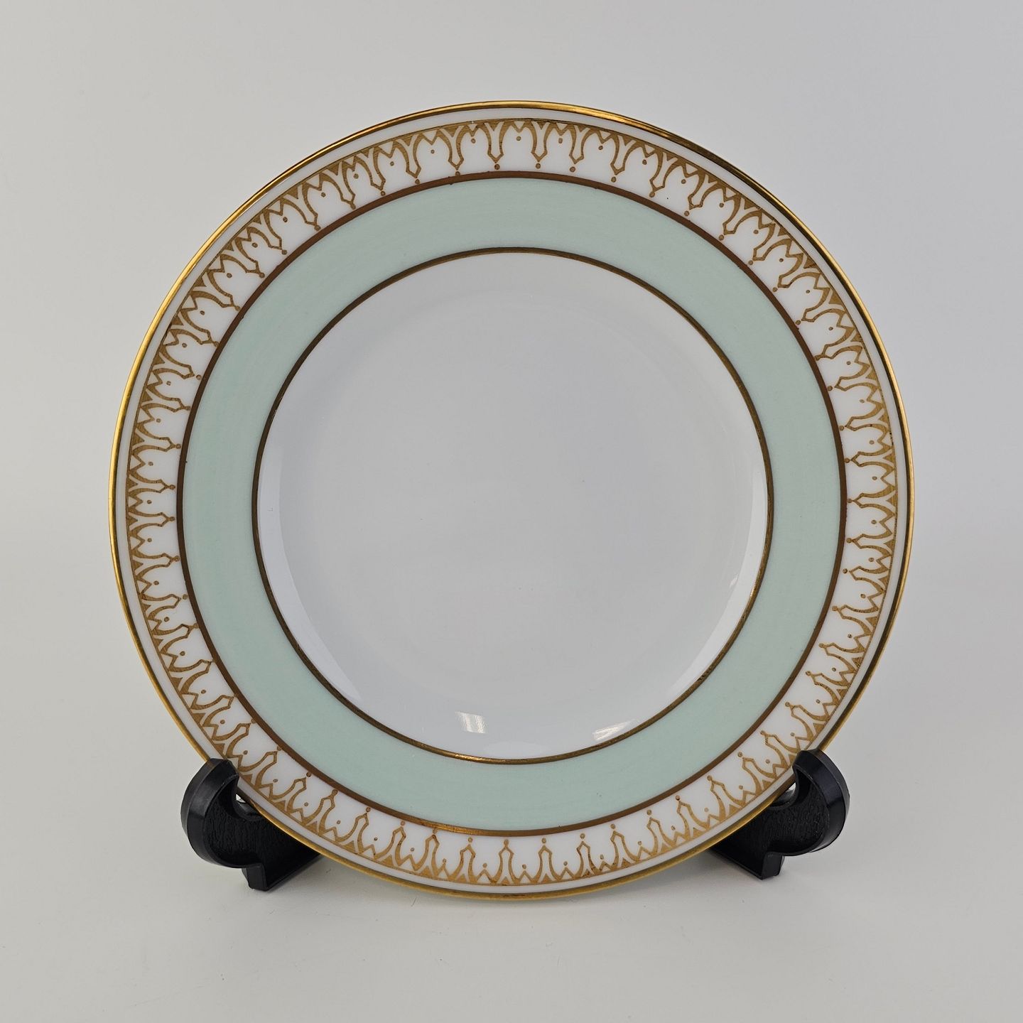 Thorvaldsen er stel i glat hvidt porcelæn med lysegrøn bort, forgyldt dekoration og guldkant