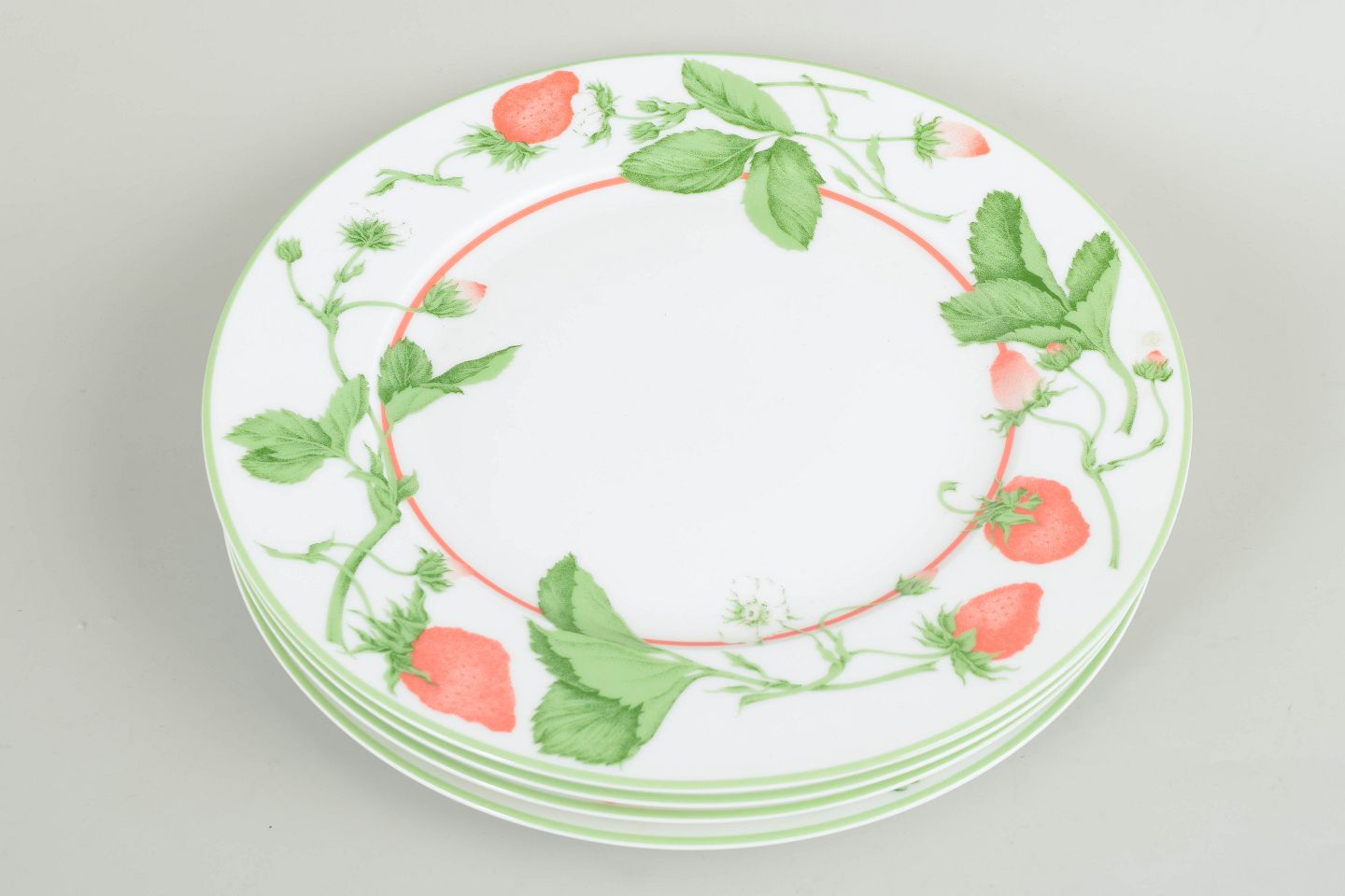 Limoges porcelain is renowned for its fine quality and long tradition of decorated tableware. During the 1980s, fruit and botanical motifs became popular as a fresh and decorative element for contemporary table settings. The Fraise series is characteristic of the period, with its naturalistic strawberry motif and coloured rims creating a light and classic appearance.