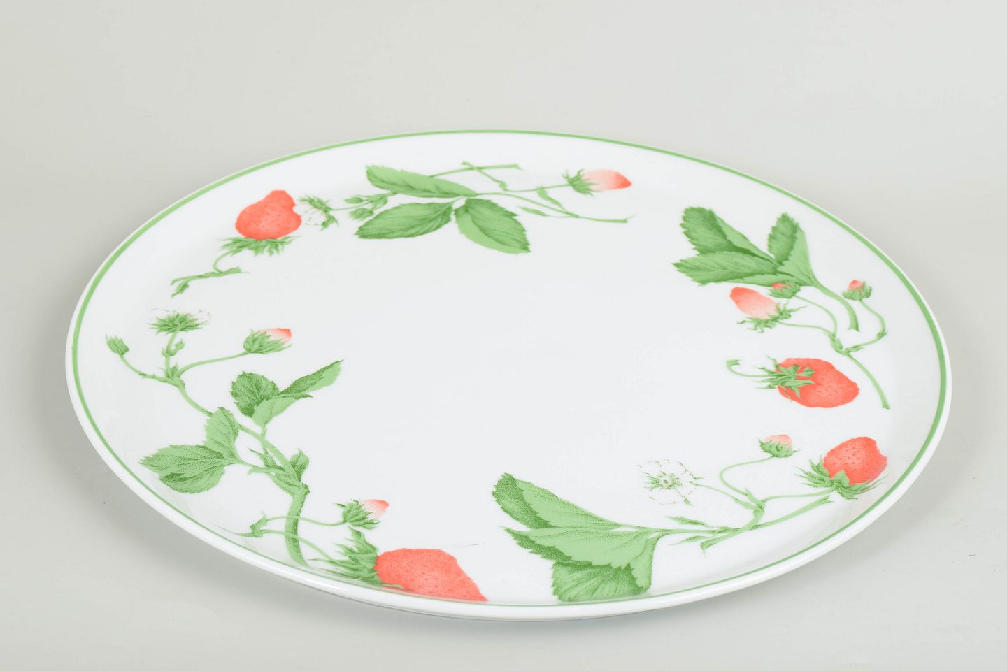 Large round porcelain serving tray with strawberry and leaf decoration around the rim, from the Fraise series.