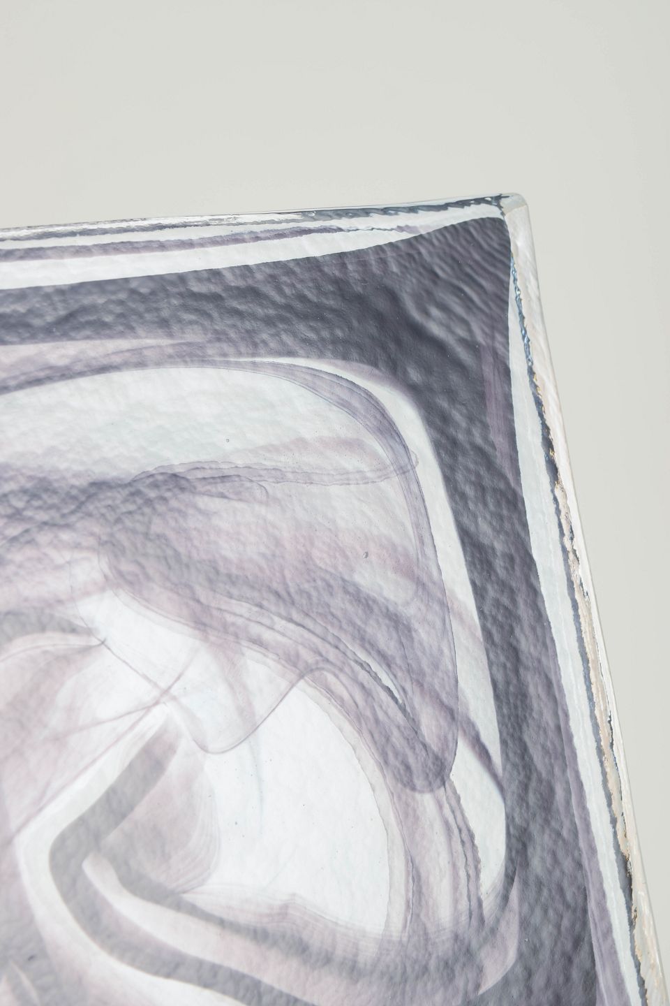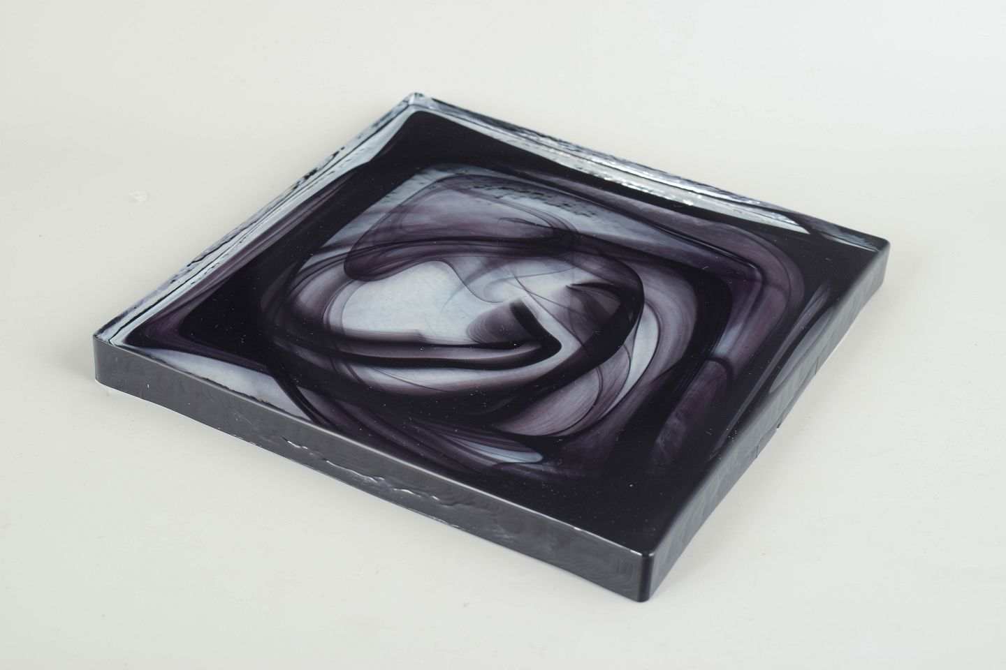 Flat, square object in clear glass with embedded swirling black and grey glass threads forming an abstract cirrus-like pattern. The model is known as Cirrus Black.