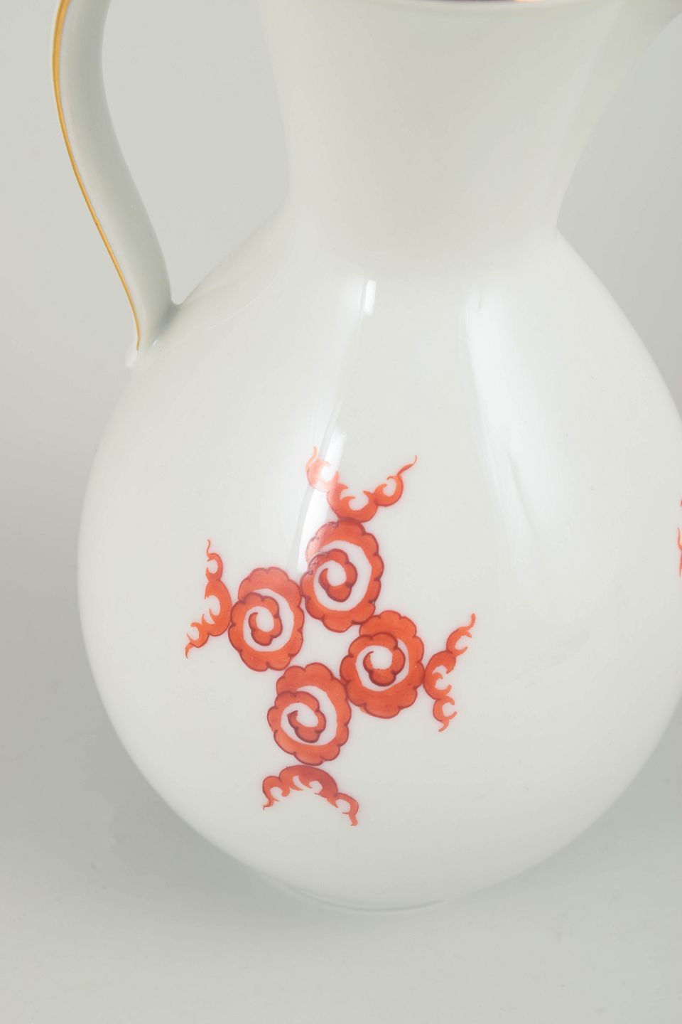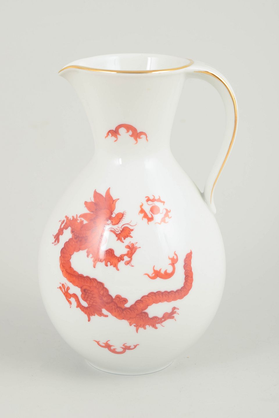 Baluster-shaped jug in white-glazed porcelain decorated with a red Ming dragon and a gilt rim. The model was produced in the Meissen area and is not made by the Royal Meissen manufactory.