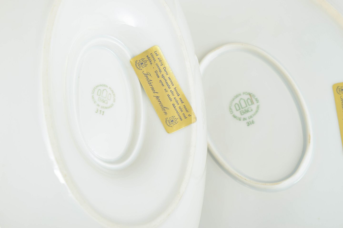 During the 1920s, Bing & Grøndahl produced refined serving pieces characterised by a clear, geometric design language. The contrast between the white porcelain body and the gilded border reflects the Art Deco aesthetic of the period and gives the set a formal and elegant appearance suitable for presentation and serving.