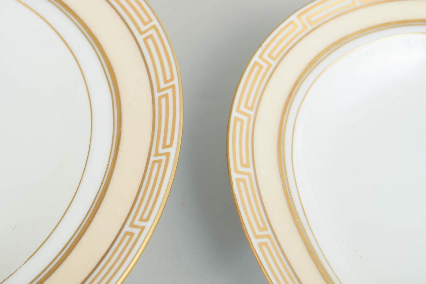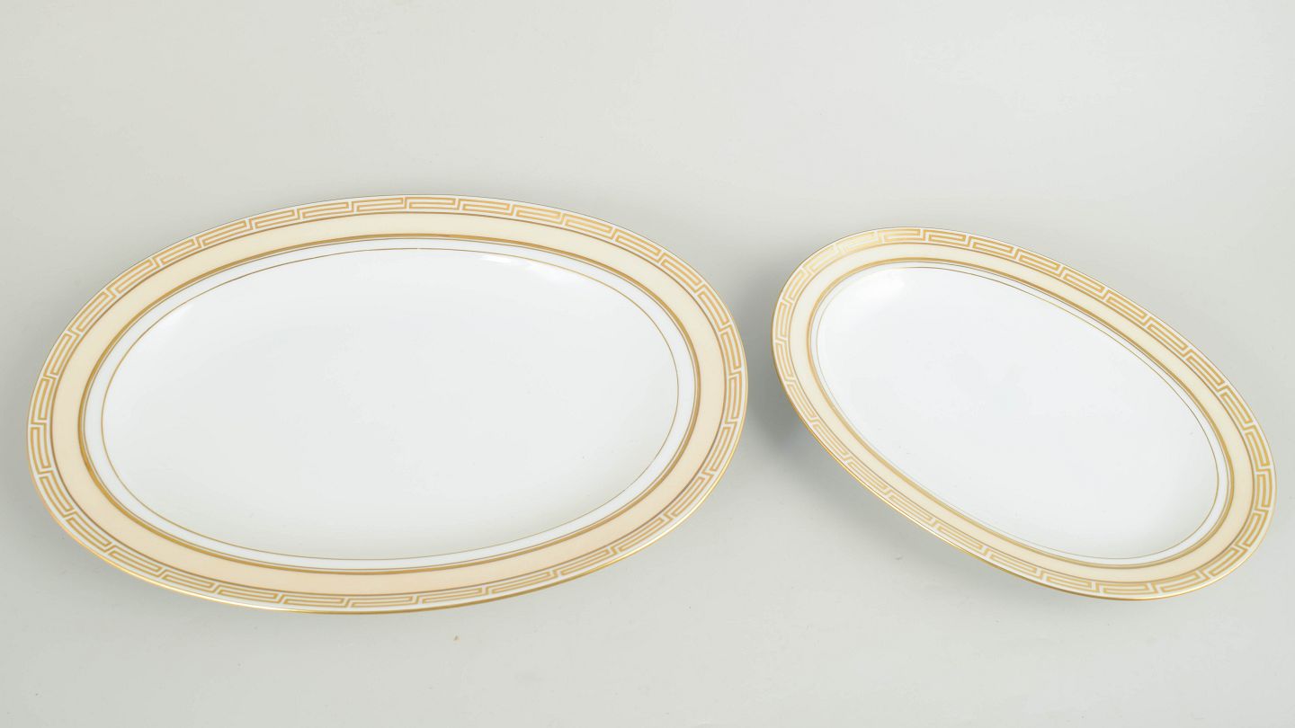 Set of two oval serving trays in white-glazed porcelain with a gilded rim and geometric Art Deco border; model 18 and 316.
