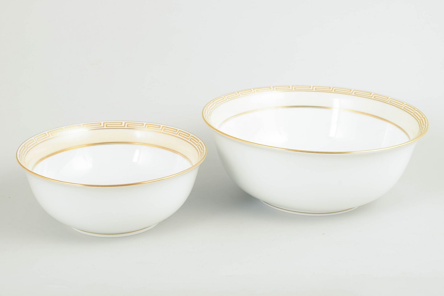 Two bowls in white-glazed porcelain with a gilt geometric border in a classic Art Deco style along the rim.