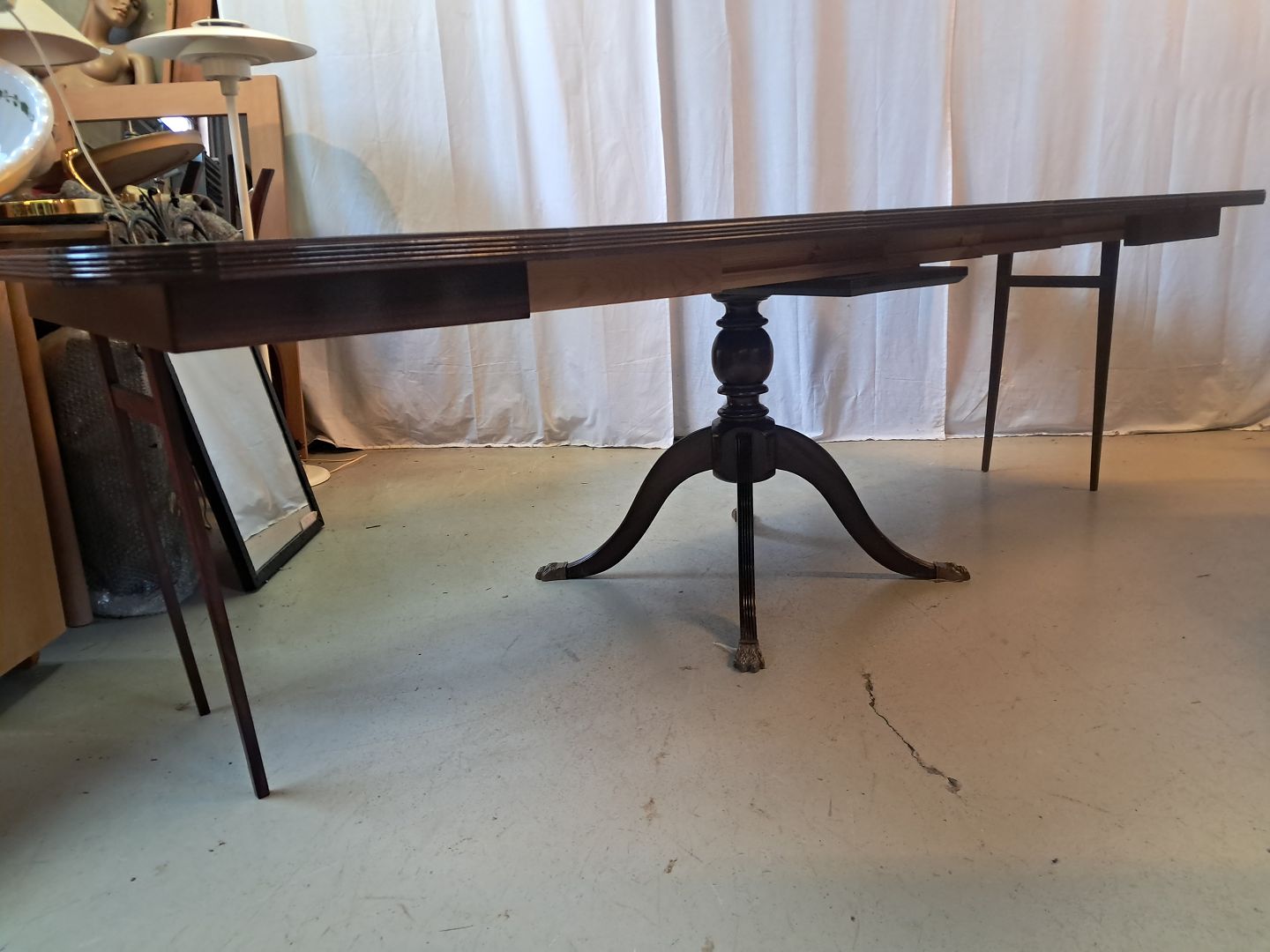 Spisebord i fineret mahogni med 3 tillægsplader, fra 1980erne.