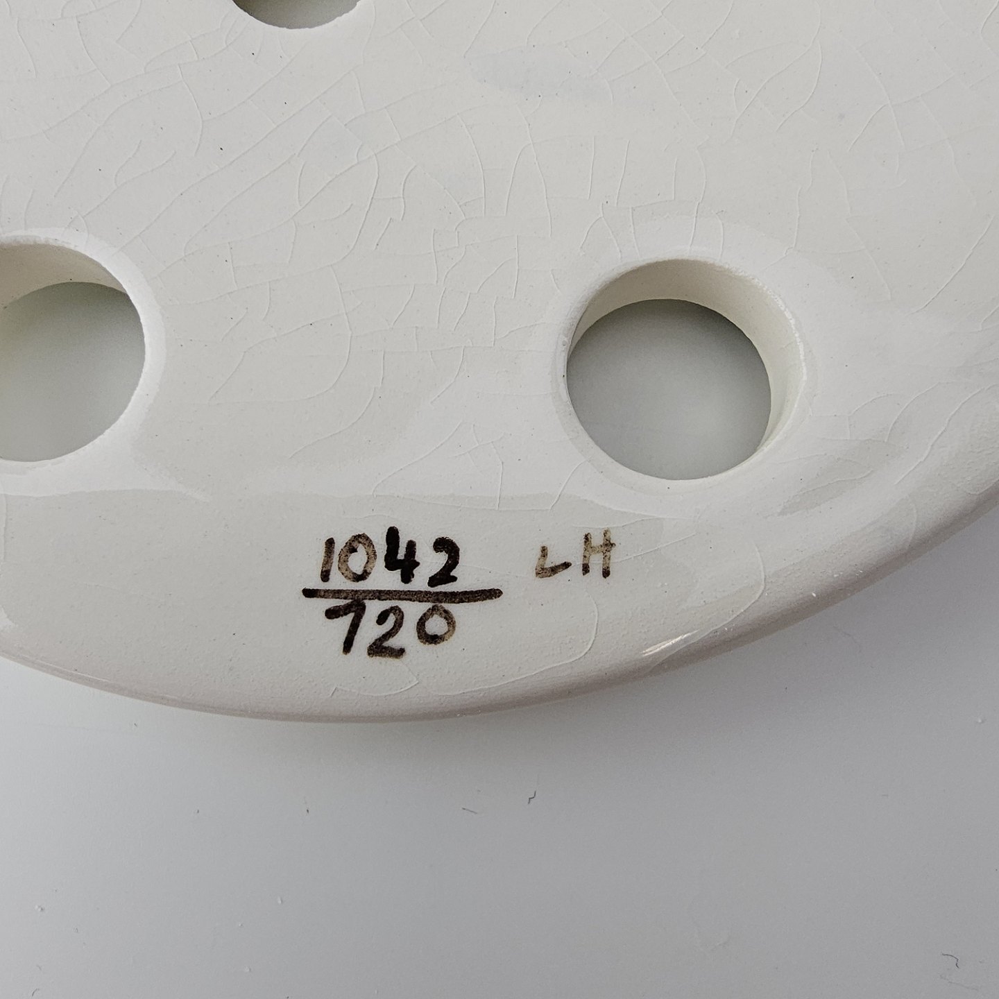 Oval jardiniere med låg i fajance med dekoration af en blå blomst og grønne blade. Nr. 1042/720