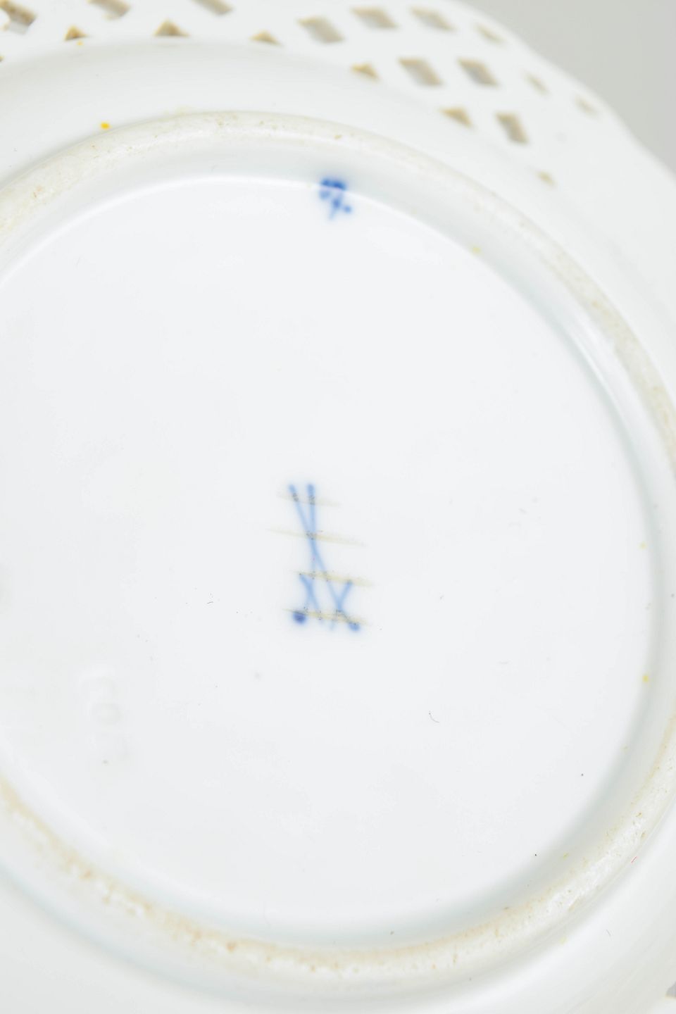 The Blue Onion pattern by Meissen is one of the most recognisable and widely produced designs in European porcelain history. Openwork plates with lattice rims were commonly used for cakes or desserts and combine technical skill with decorative lightness, framing the Chinese-inspired motif within an airy ornamental border.