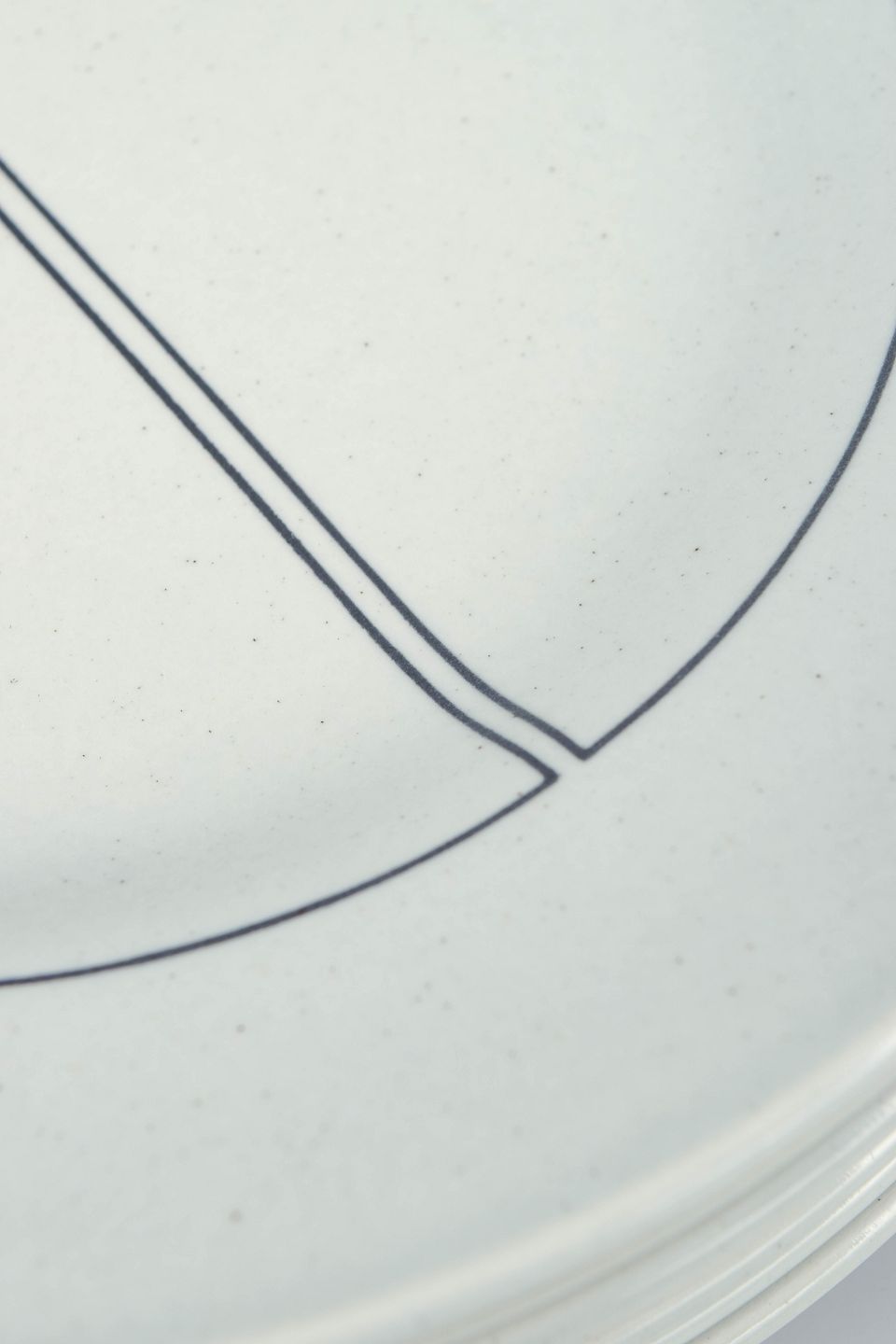 Flat faience plates with white glaze and graphic decoration featuring a black circle and diagonal line, produced in the “Demi” model.