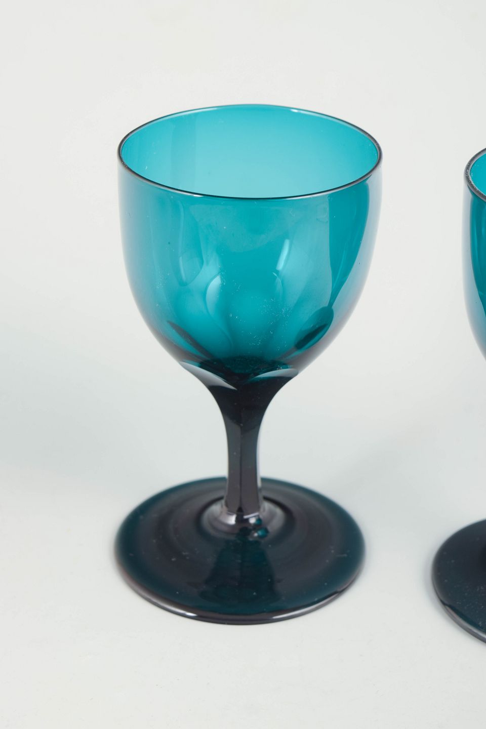 Two crystal white wine glasses with petrol blue bowls and darker, faceted stems.