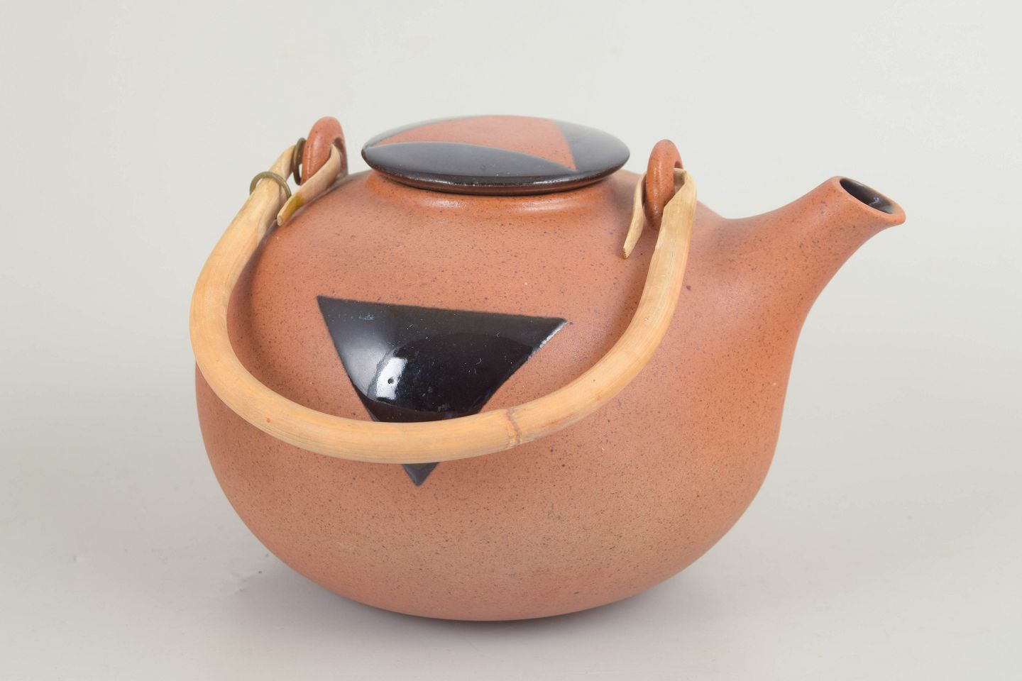 Rare stoneware teapot with a matte warm orange/sand-toned glaze and a bold black triangular motif on the body. Fitted with a black lid and a tall swing handle that gives the piece a distinctly sculptural profile. Model 332.