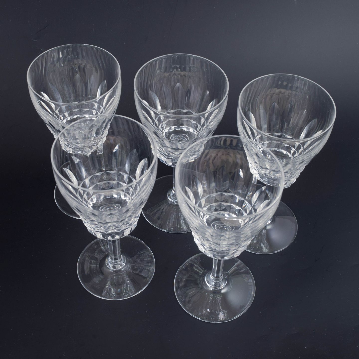 Set of five French red wine glasses in clear crystal, featuring a faceted bowl and a classic stem. The cut surfaces catch the light beautifully, giving a refined mid-20th-century look.