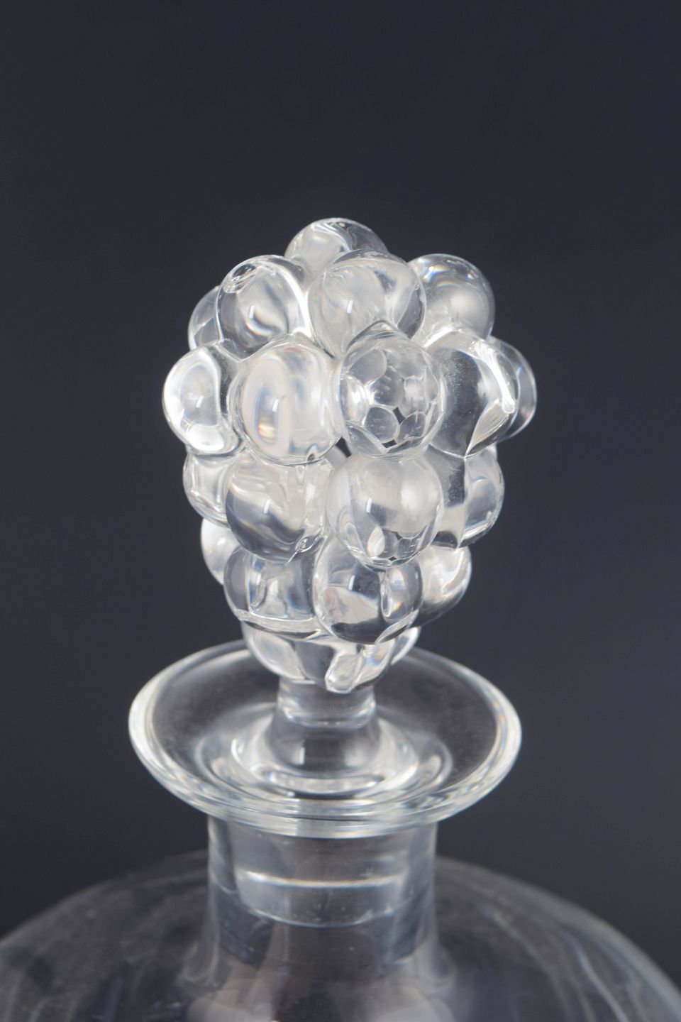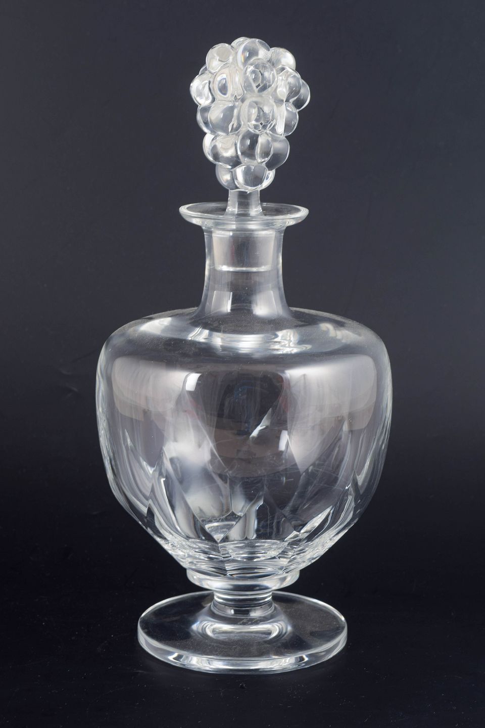 Large and rare wine decanter in clear moulded glass with relief-cut body and a stopper formed as a cluster of grapes. The “Clos Vougeot” model is characterised by Art Deco-inspired symmetry and faceted surfaces that catch and reflect the light, emphasising the purity of the glass. Signed to the base.