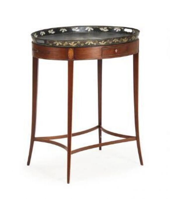 Oval Regency tray table of mahogany, circa 1800, decorated with inlay in the shape of a conch shell, frame with drawer and blind drawer, sides with candle holders, provided with tray of black painted metal with motif in the shape of a seated woman. H. 75 cm. W. 50 cm. L. 65.5 cm.