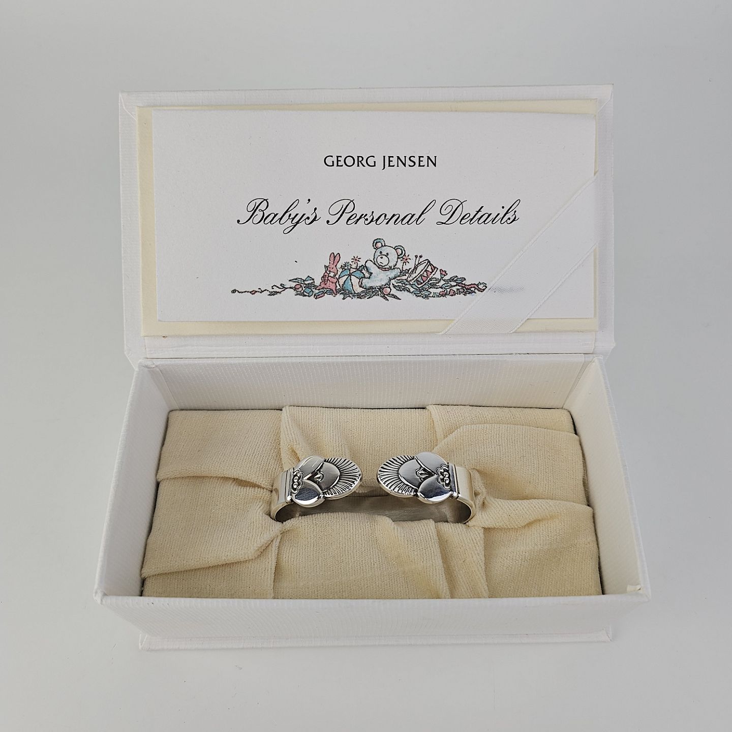 Servietring med Kaktus mønster i sterling sølv med tilhørende æske og kort, Baby's Personal Details