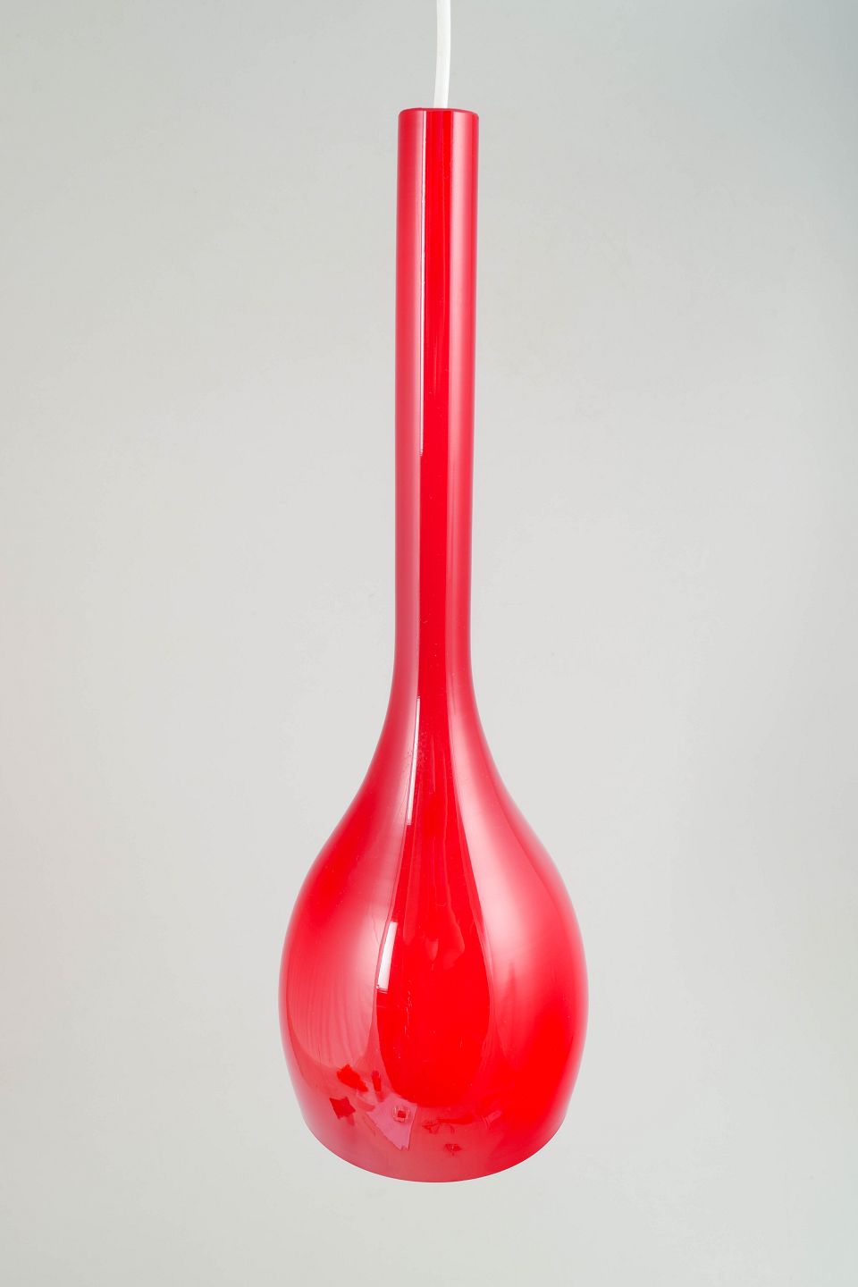 Late 20th-century Scandinavian lighting design often paired clean, sculptural silhouettes with bold, saturated colour. Mouth-blown art glass was used to introduce depth and light transmission in pendant lamps, where the elongated profile and intense hue create a crisp, modern statement both illuminated and unlit.