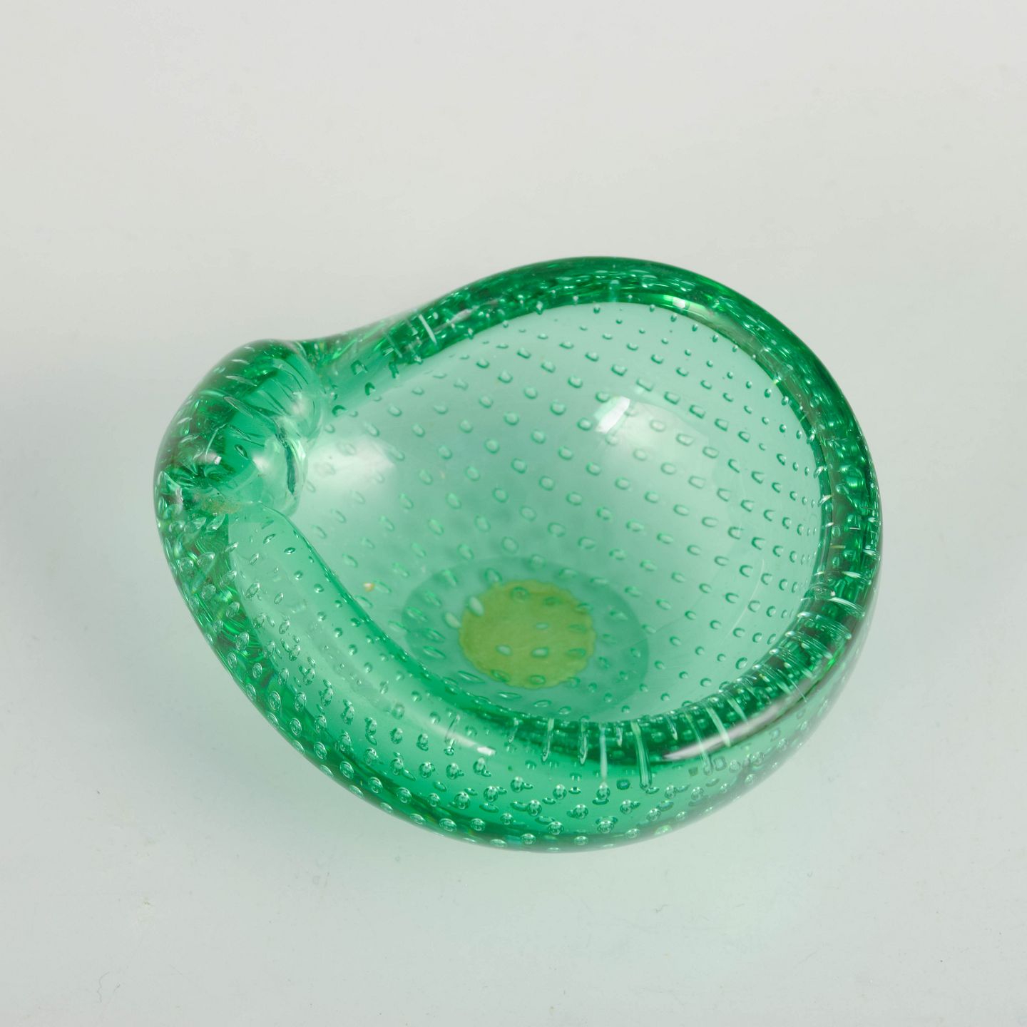 Organically shaped small bowl in green art glass with controlled bubbles and a textured “dotted” surface, retaining the original “Made in Murano Italy” label.