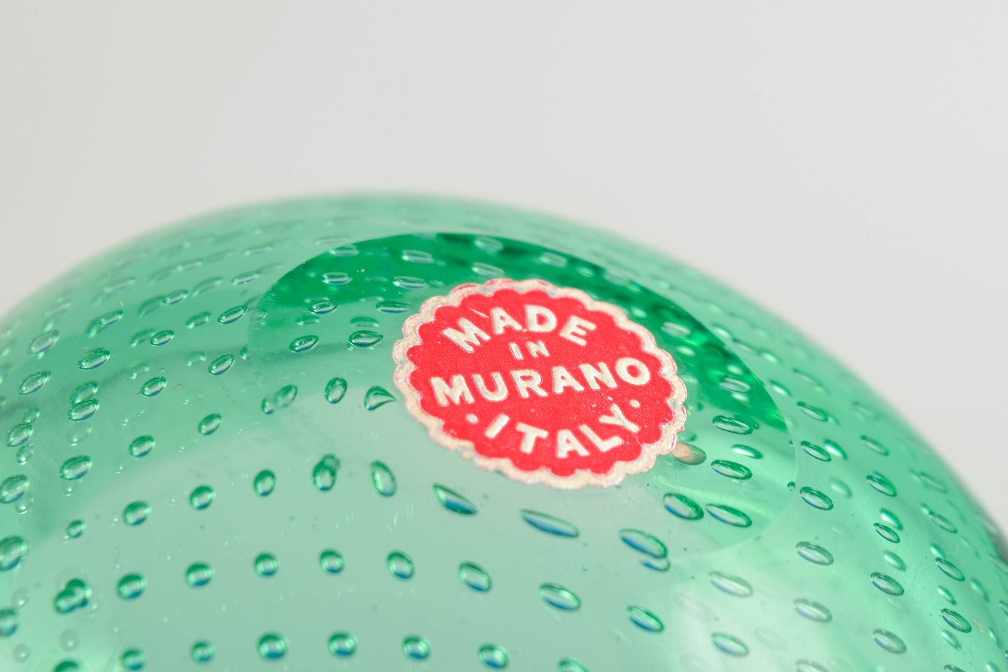 Mid-20th-century Murano glass is celebrated for skilled hand production and playful experimentation with colour, bubbles, and surface texture. Small bowls like this were commonly made as decorative objects and giftware, with origin labels serving as a clear provenance marker and a practical sales aid in the export market.