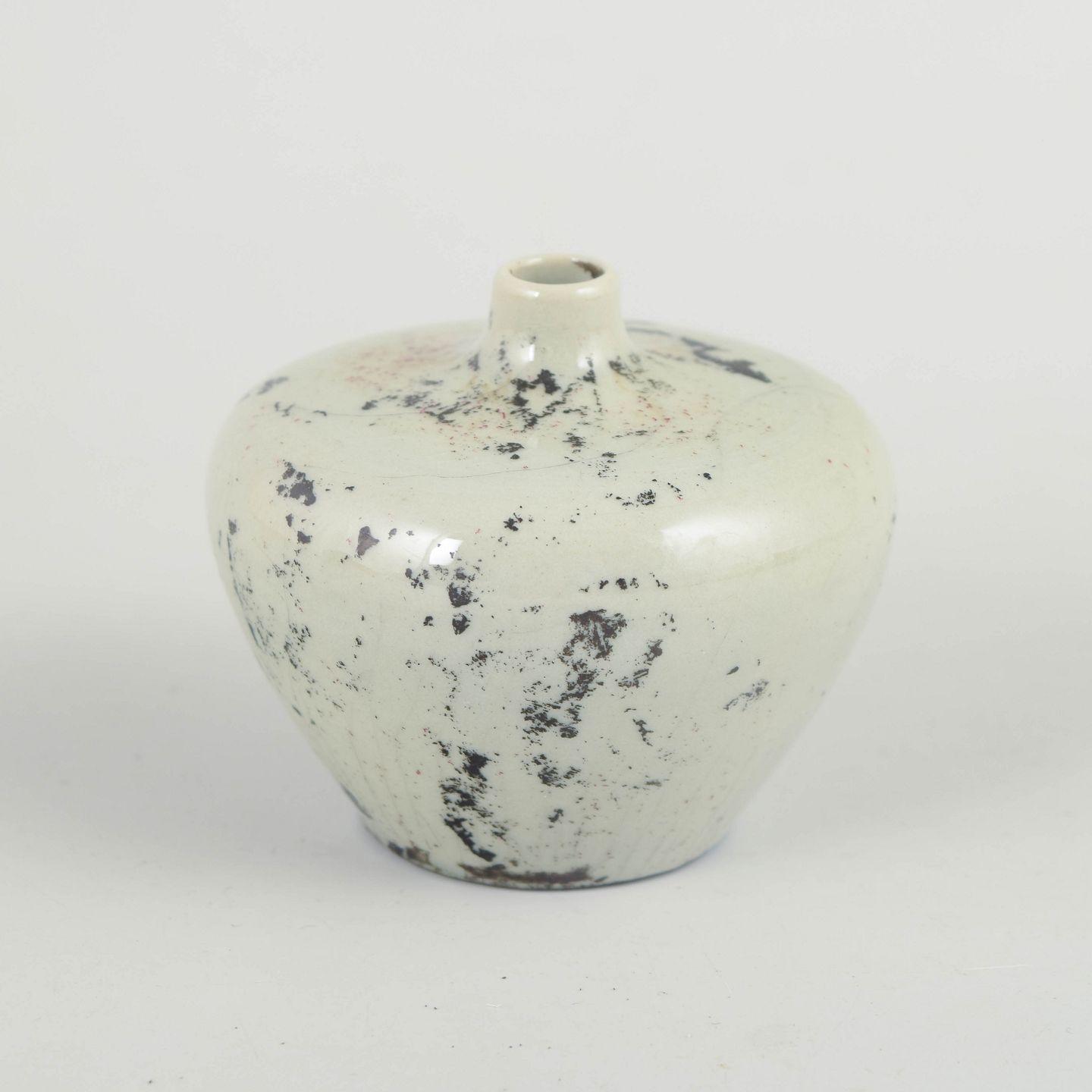 Small wheel-thrown stoneware vase with a light cream glaze and speckled decoration in darker tones, with a softly rounded form, produced in first factory quality.