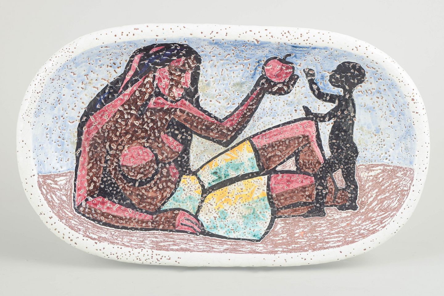 Unique figurative wall relief in glazed stoneware with a stylised mother and child motif rendered in strong earthy colours and contrasting outlines.