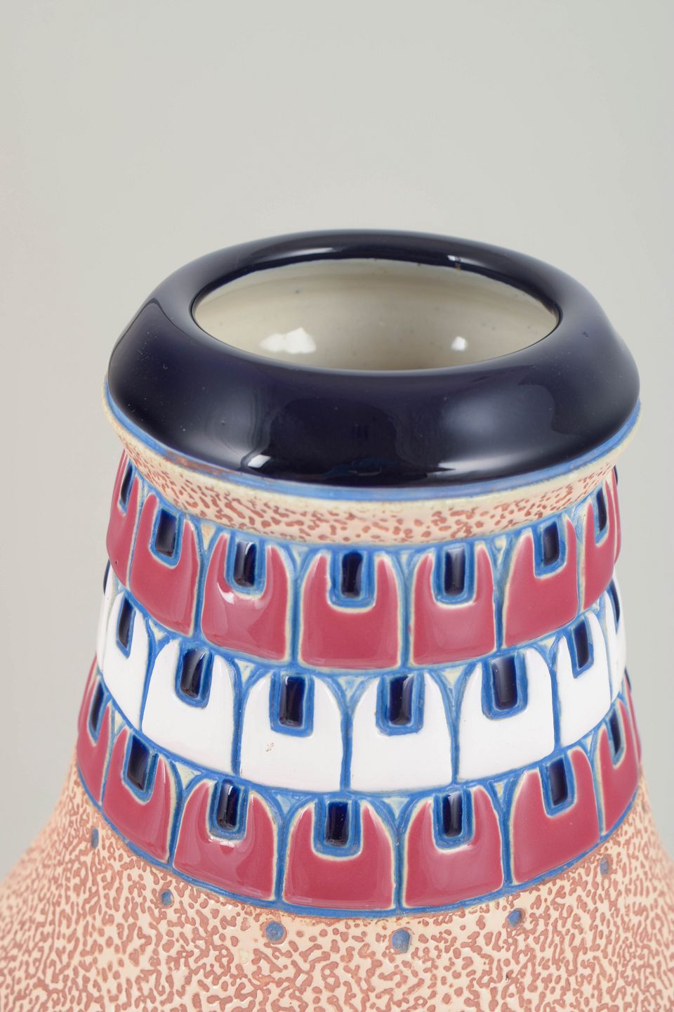 Czechoslovakian art ceramics of the 1930s were often characterised by a synthesis of Art Deco and folk-inspired ornamentation, combining stylised animal and plant motifs with geometric patterning in vivid colours. Enamel decoration allowed for strong contrasts and saturated hues, and large Amphora vases such as this were conceived as striking interior features in contemporary middle-class homes.