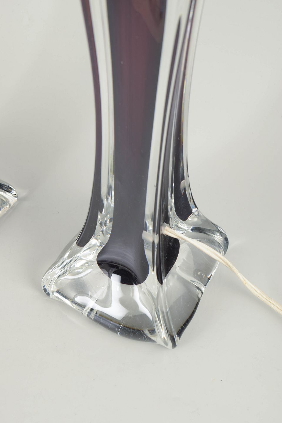 Pair of table lamps in purple art glass with tall faceted bodies and a clear base.
