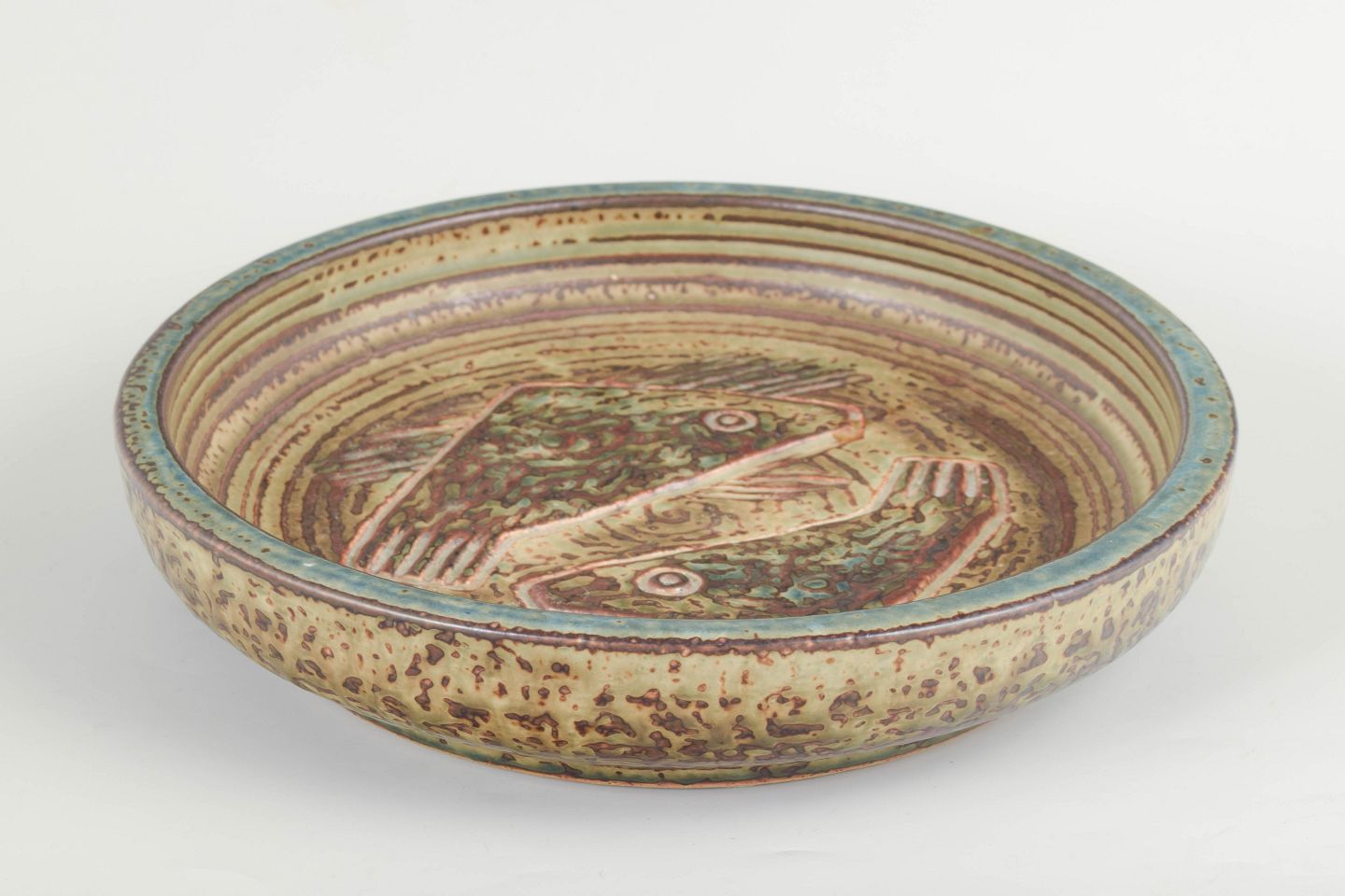 Large circular stoneware dish with glazed surface and a central stylised fish motif in earthy tones, combined with contrasting glaze bands. Model 21937.